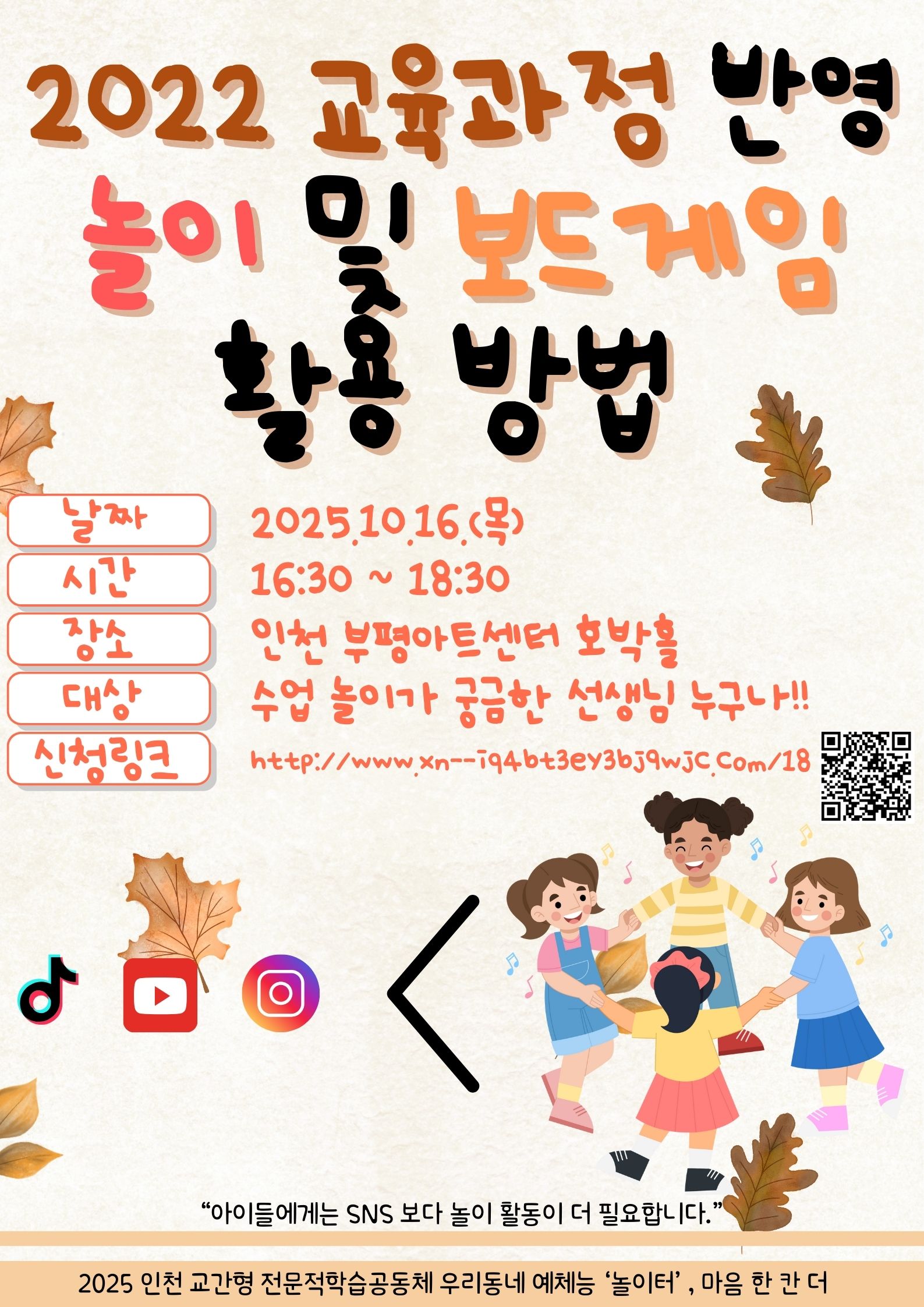연합팀 놀이교육 부평구 AI 연계 교육과정에서 활용할 수 있는 놀이 및 보드게임 나눔 연수 공동체명우리동네 예·체능 ‘놀이’터, 마음 한 칸 더 일시2025년 10월 16일 16:30 - 18:30 장소부평아트센터 2층 호박홀 좌석28석 / 50석 나눔방법공개연수(대면) 담당자금곡초 박윤진 신청기간 마감 목록보기
