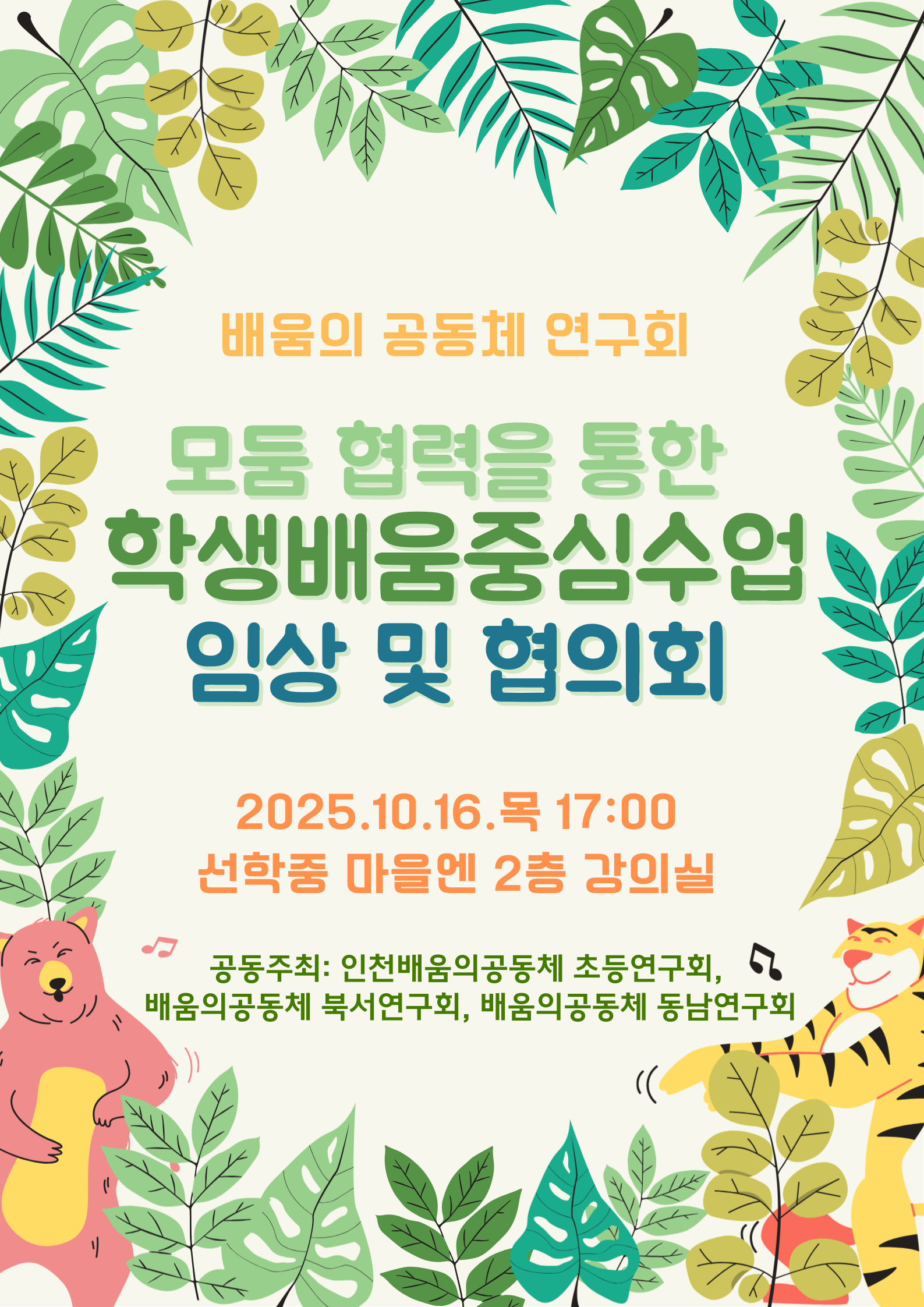연합팀 미래교육 연수구 모둠 협력을 통한 학생배움중심수업 임상 및 협의회 공동체명배움의공동체 동남연구회, 배움의공동체 북서연구회, 인천배움의공동체 초등연구회, 일시2025년 10월 16일 17:00 - 19:00 장소선학중학교 마을엔 2층 강의실 좌석32석 / 100석 나눔방법워크숍(대면) 담당자선학중 차민정 신청기간 마감 목록보기