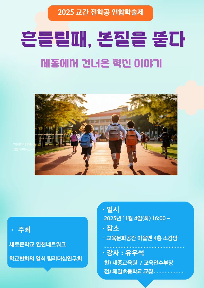 연합팀 미래교육 남동구 흔들릴 때 본질을 묻다 (세종에서 건네온 혁신이야기) 공동체명새로운학교 인천네트워크, 학교변화의 열쇠 팀리더십 연구회 일시2025년 11월 04일 16:00 - 18:00 장소선학중학교 마을엔 좌석29석 / 50석 나눔방법공개연수 (대면) 담당자도담초 이태섭 신청기간 마감 목록보기