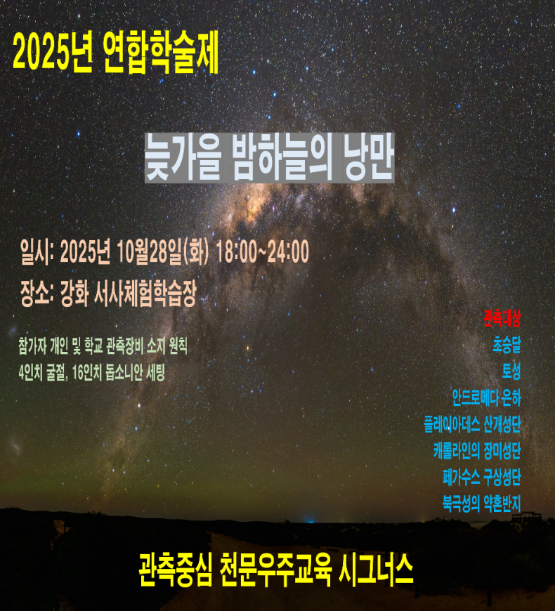 교과교육연구(회)형 과학 강화군 늦가을 밤하늘의 낭만 공동체명관측중심의 천문우주교육 시그너스 일시2025년 10월 28일 18:00 - 24:00 장소강화 서사체험학습장 좌석12석 / 15석 나눔방법워크숍/관측회(대면) 담당자인천여고 이창우 신청기간 마감 목록보기