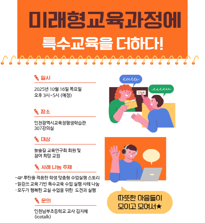 교과교육연구(회)형 교육과정(IB 등) 연수구 미래형교육과정 기반 특수교육 수업 실행 사례 공동체명늘솔길 교육연구회 일시2025년 10월 16일 15:00 - 17:00 장소인천광역시교육청 평생학습관 307호 강의실 좌석16석 / 17석 나눔방법수업나눔(대면) 담당자인천남부초 김지혜 신청기간 마감 목록보기