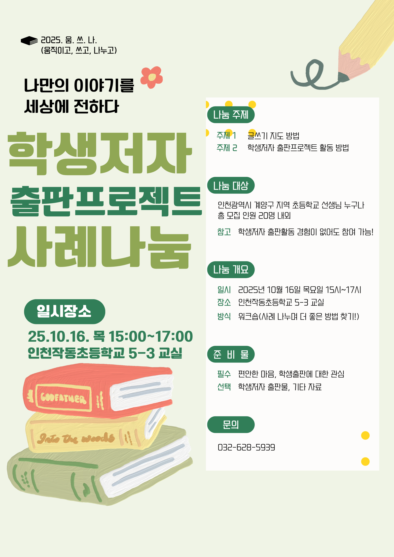 주제연구형 읽걷쓰교육 계양구 학생저자출판프로젝트 공동체명2025 움. 쓰. 나. 일시2025년 10월 16일 15:00 - 17:00 장소인천작동초 5-3교실 좌석14석 / 20석 나눔방법워크숍 (대면) 담당자인천작동초 박승훈 신청기간 마감 목록보기