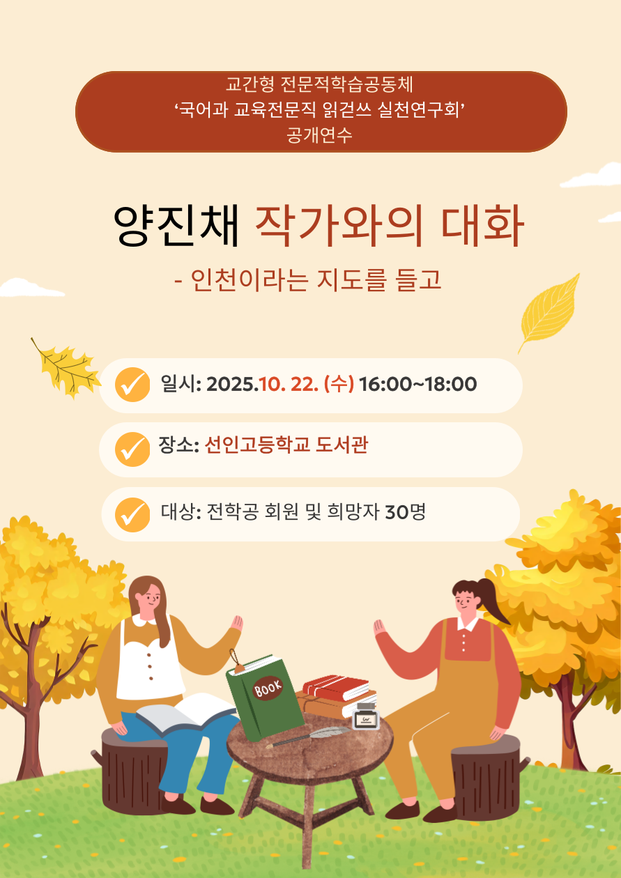 주제연구형 읽걷쓰교육 미추홀구 양진채 작가와의 대화-인천이라는 지도를 들고 공동체명국어과 교육전문직 읽걷쓰 실천연구회 일시2025년 10월 22일 16:00 - 18:00 장소선인고 도서관 좌석9석 / 30석 나눔방법공개연수(대면) 담당자세계로국제중고 이정화 신청기간 마감 목록보기