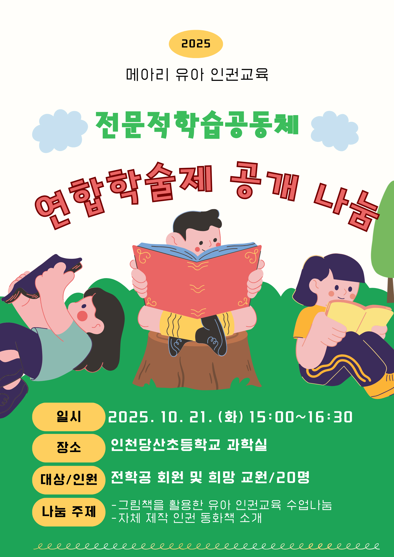 주제연구형 국어/독서교육 계양구 그림책을 활용한 유아 인권교육 수업 나눔 및 자체 제작 인권 동화책 소개 공동체명메아리 유아 인권교육 일시2025년 10월 21일 15:00 - 16:30 장소인천당산초 과학실 좌석15석 / 20석 나눔방법수업나눔(대면) 담당자인천도담초병설유치원 박혜영 신청기간 마감 목록보기