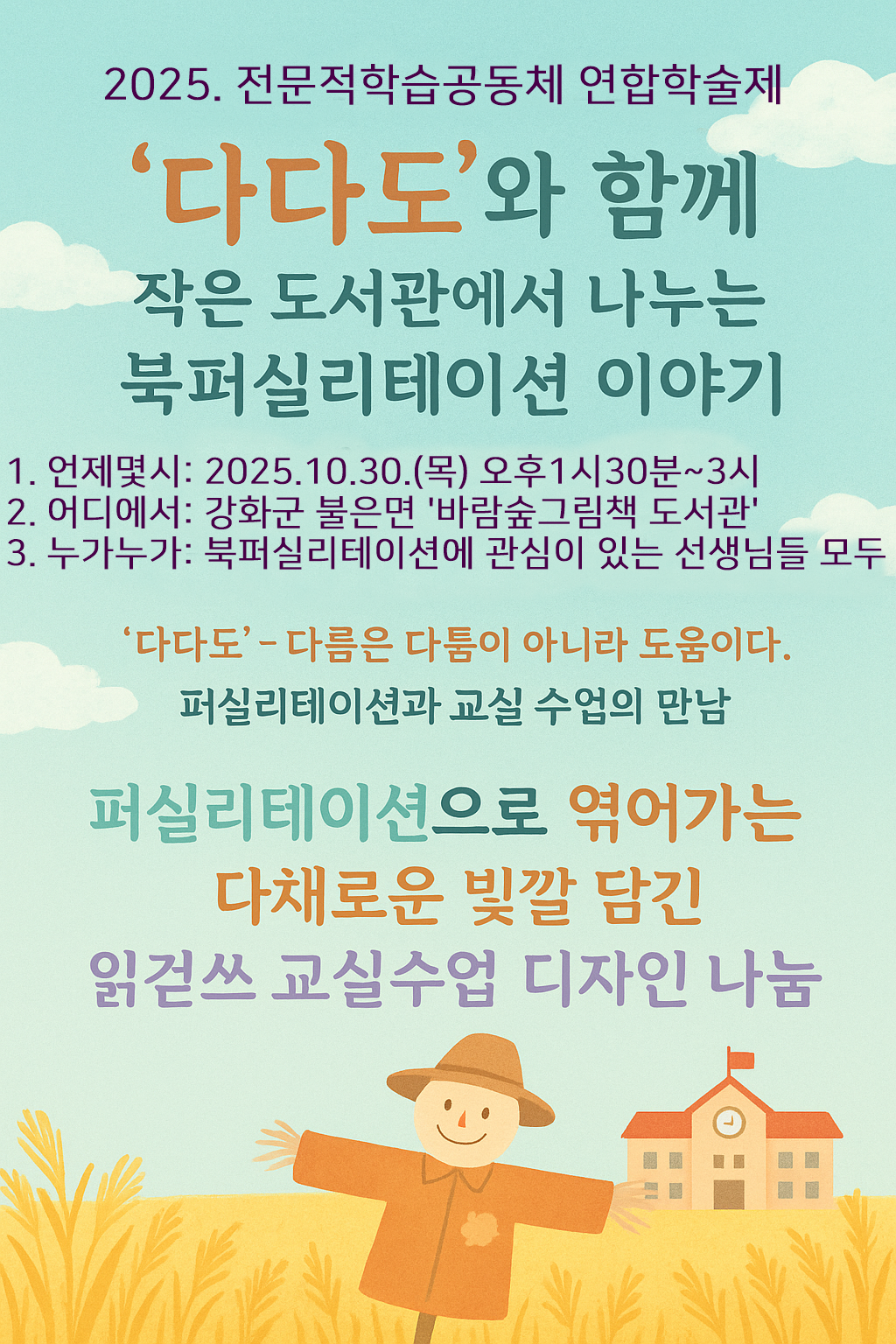 주제연구형 읽걷쓰교육 강화군 북퍼실리테이션으로 읽걷쓰 수업 디자인하기 공동체명다다도 읽걷쓰 퍼실수업 연구회 일시2025년 10월 30일 13:30~16:30 장소내가초 및 바람숲그림책도서관 좌석16석 / 30석 나눔방법워크숍(대면) 담당자인천길주초 문숙 신청기간 마감 목록보기