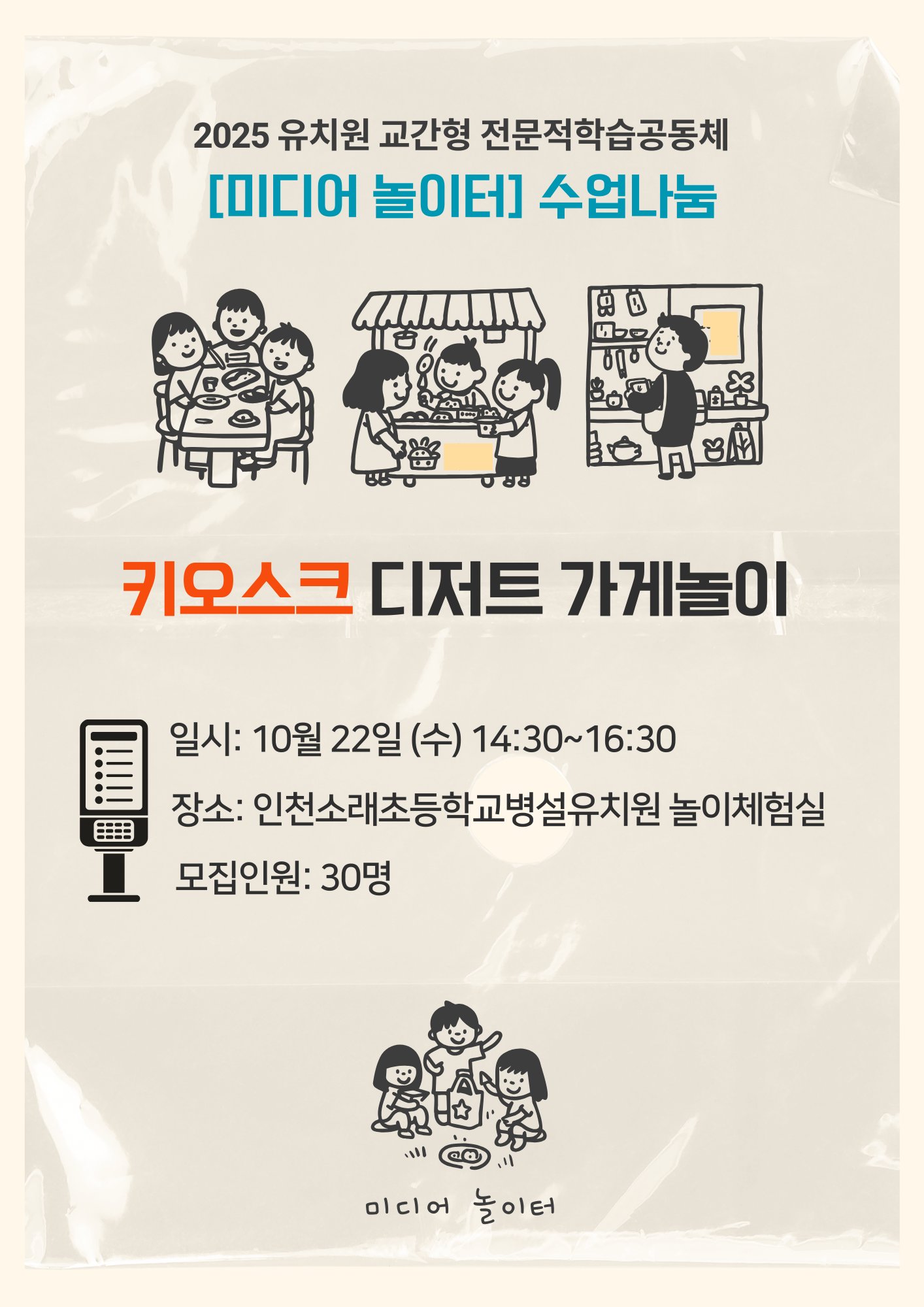 주제연구형 놀이교육 남동구 키오스크 디저트 가게놀이 공동체명미디어 놀이터 일시2025년 10월 22일 14:30 - 16:30 장소인천소래초병설유치원 놀이체험실 좌석21석 / 30석 나눔방법수업나눔(대면) 담당자인천예송초병설유치원 양혜원 신청기간 마감 목록보기
