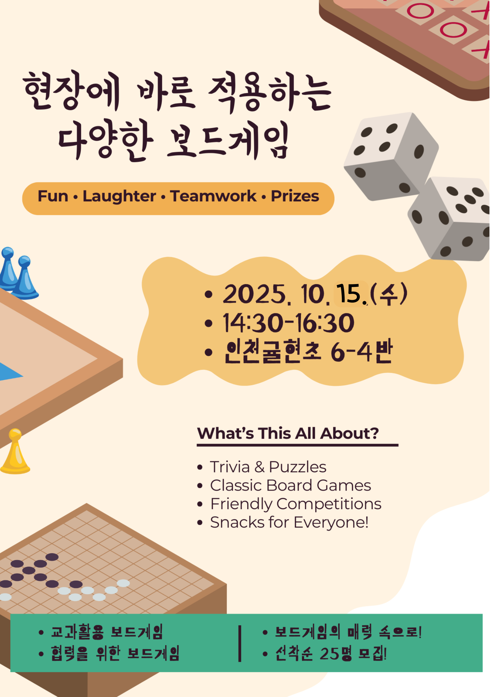 주제연구형 놀이교육 계양구 현장에 바로 적용하는 다양한 보드게임 공동체명보드PLAY 일시2025년 10월 15일 14:30 - 16:30 장소인천귤현초 6-4교실 좌석22석 / 25석 나눔방법워크숍(대면) 담당자인천귤현초 오윤희 신청기간 마감 목록보기