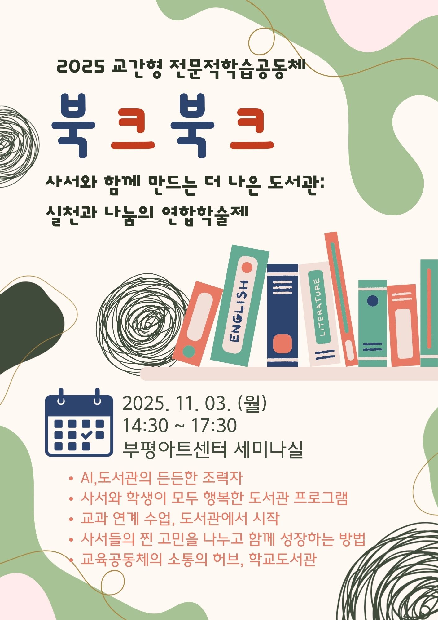 주제연구형 읽걷쓰교육 부평구 사서와 함께 만드는 더 나은 도서관 공동체명북크북크(책으로 크다) 일시2025년 11월 03일 14:30 - 17:30 장소부평아트센터 세미나실 좌석41석 / 41석 나눔방법워크숍(대면) 담당자인천부일초 장현경 신청마감 목록보기