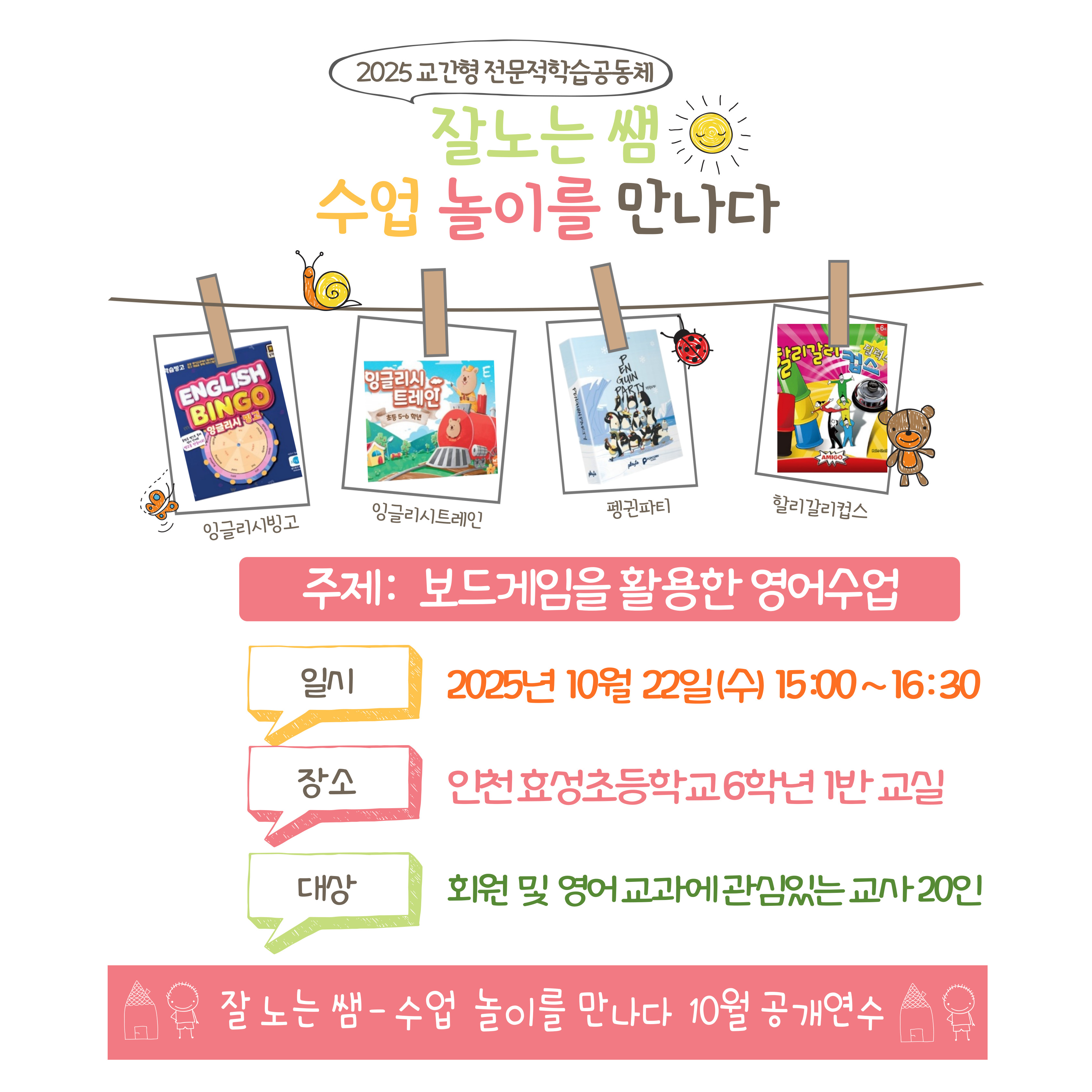 주제연구형 놀이교육 계양구 영어 교과에 적용 가능한 보드게임을 활용한 수업 활동 공동체명잘노는쌤_수업 놀이를 만나다 일시2025년 10월 22일 15:00 - 16:30 장소인천효성초 6-1교실 좌석7석 / 20석 나눔방법워크숍(대면) 담당자인천가현초 박미란 신청기간 마감 목록보기