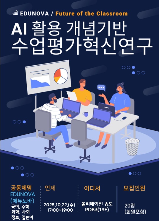 교과교육연구(회)형 미래교육 연수구 AI활용 개념기반 수업평가혁신연구 공동체명에듀노바 일시2025년 10월 22일 17:00 - 19:00 장소홀리데이 인 송도 PDR3(19F) 좌석12석 / 20석 나눔방법수업나눔(대면) 담당자신송고 김칠선 신청기간 마감 목록보기