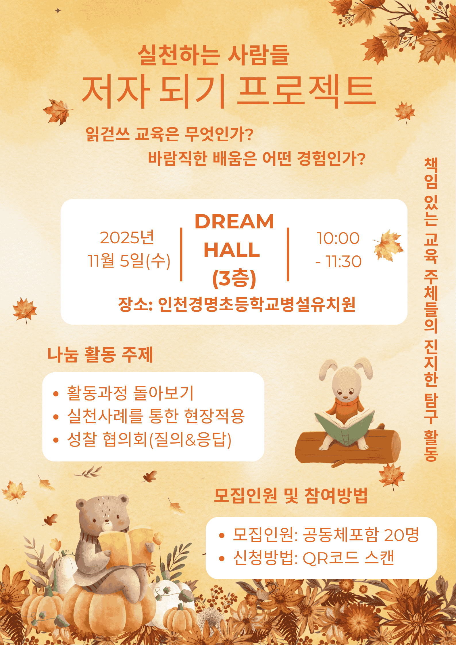 주제연구형 읽걷쓰교육 서구 저자되기, 글쓰기 실천사례를 통한 현장적용 공동체명실천하는 사람들 일시2025년 11월 05일 10:00 - 11:30 장소인천경명초 3층 드림홀 좌석14석 / 20석 나눔방법워크숍(대면) 담당자인천도담초병설유치원 황순주 신청기간 마감 목록보기