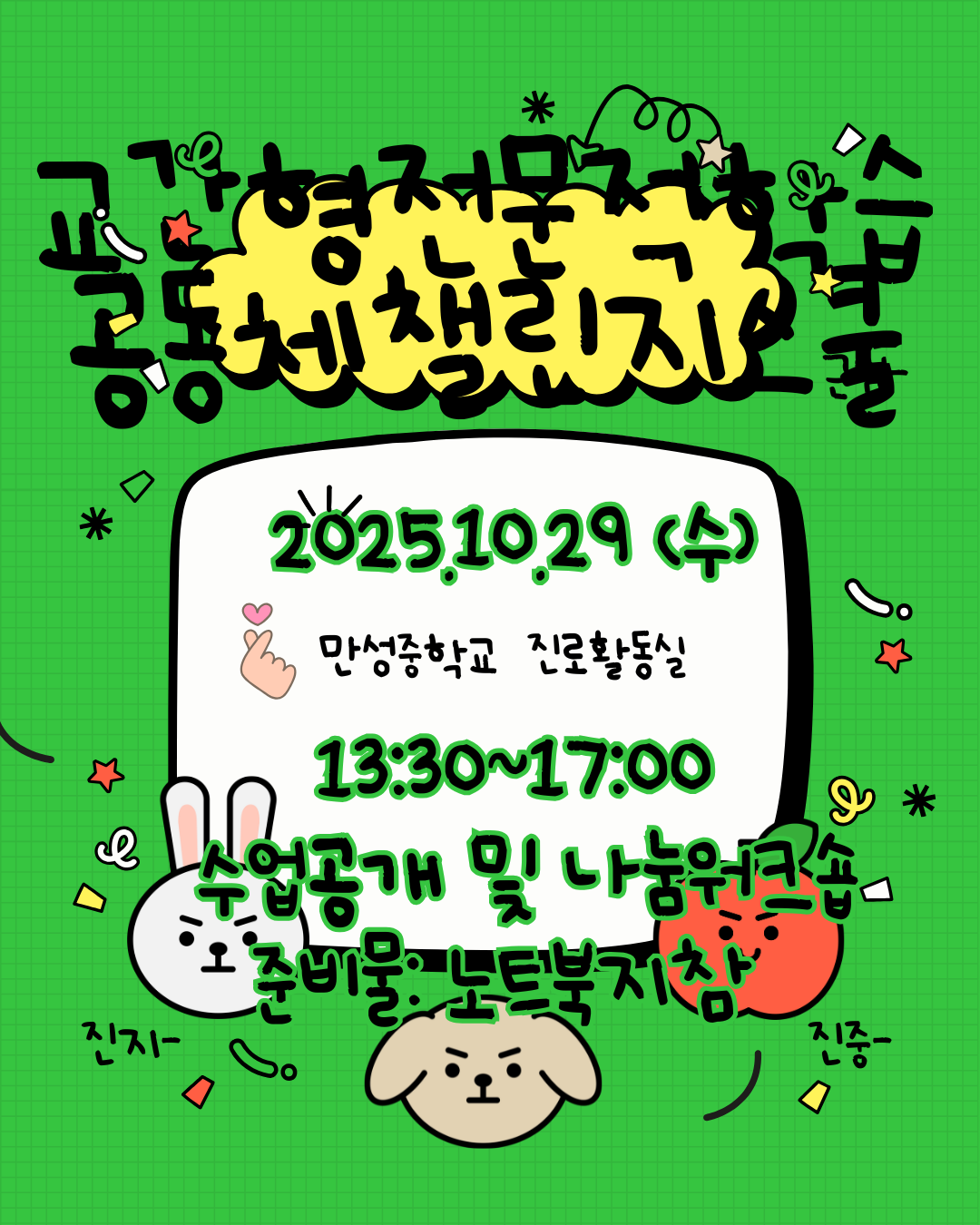 교과교육연구(회)형 사회정서학습(SEL) 남동구 4P읽걷쓰 루틴으로 나를 찾는 행복한 여행 공동체명챌린지스쿨 일시2025년 10월 29일 13:30 - 15:10 장소만성중학교 진로활동실 좌석11석 / 12석 나눔방법공개수업 및 나눔,워크숍 담당자만성중 배서영 신청기간 마감 목록보기