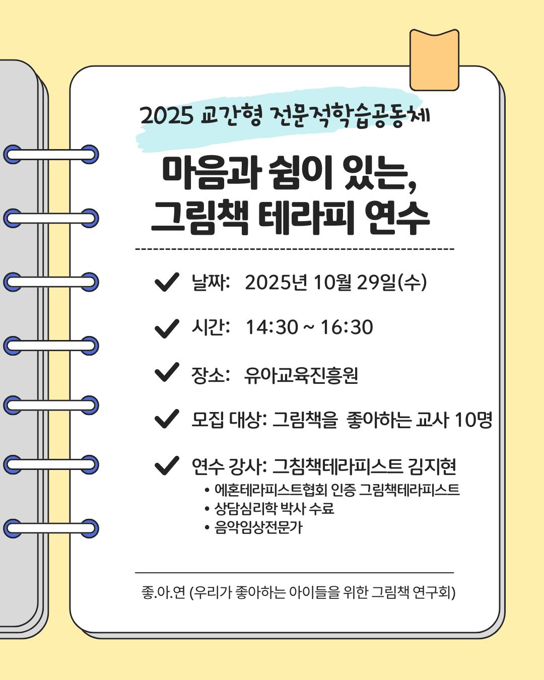 주제연구형 읽걷쓰교육 서구 그림책 테라피 연수 공동체명"좋. 아. 연 (우리가 좋아하는 아이들을 위한 그림책 연구회)" 일시2025년 10월 29일 14:30 - 16:30 장소유아교육진흥원 102호 연수실 좌석24석 / 30석 나눔방법공개연수(대면) 담당자인천아라꿈유치원 최예람 신청기간 마감 목록보기