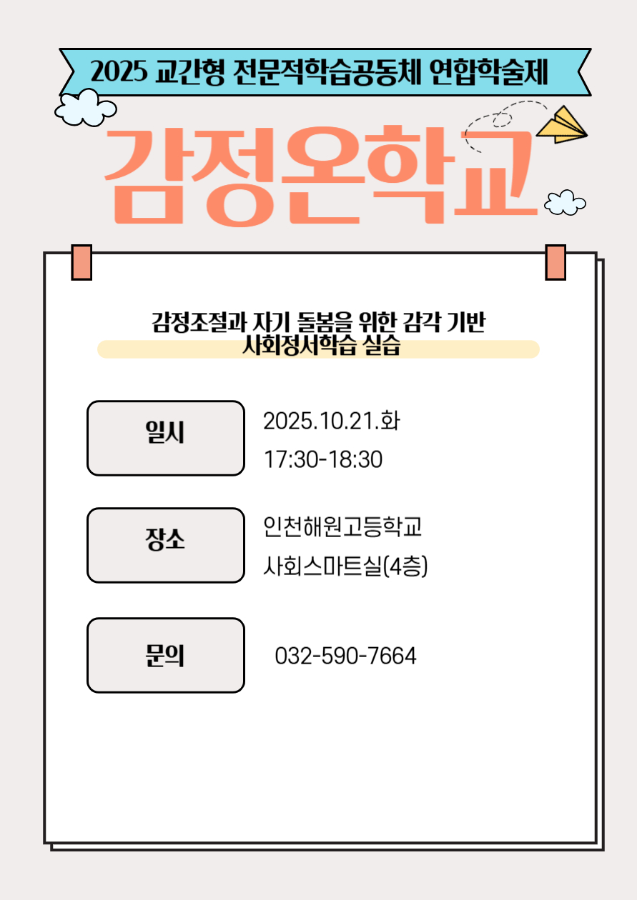 주제연구형 사회정서학습(SEL) 서구 감정아로마테라피 활용을 통한 감정 조절 적용사례 공동체명감정온학교 일시2025년 10월 21일 17:30 - 18:30 장소인천해원고 사회스마트실 좌석25석 / 25석 나눔방법워크숍(대면) 담당자인천해원고 전도현 신청마감 목록보기