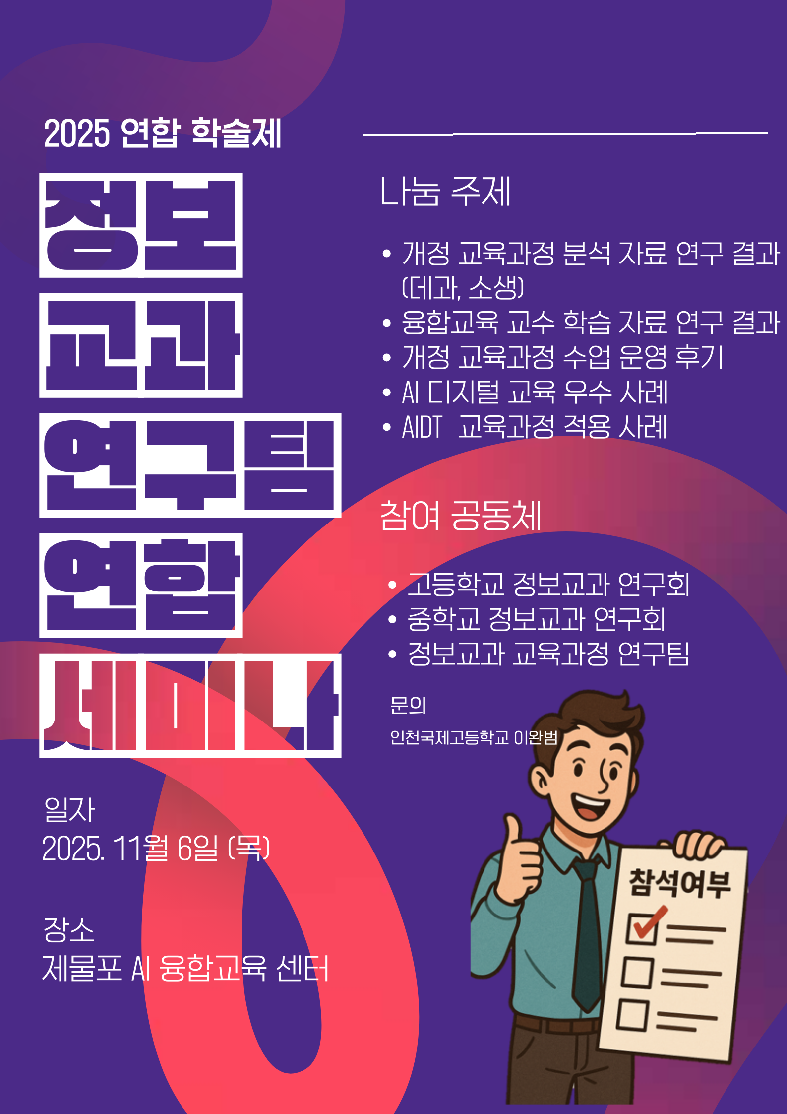 [정보교과 연구팀 연합학술제]정보교과 개정 교육과정 분석 자료 연구 결과(데과, 소생), 융합교육 교수 학습 자료 연구 결과, 개정 교육과정 수업 운영 후기, AI 디지털 교육 우수 사례, AIDT 교육