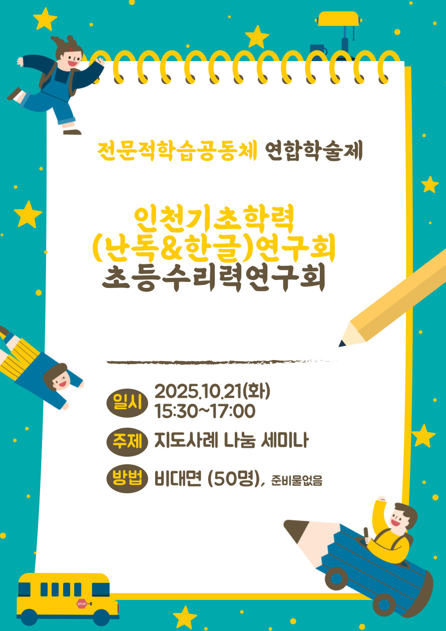 연합팀 기타 전체(비대면) 기초학력 부진학생 지도 사례 나눔 및 질의 응답 공동체명초등수리력연구회, 인천기초학력(난독&한글)연구회 일시2025년 10월 21일 15:30 ~ 17:00 장소비대면 좌석30석 / 50석 나눔방법세미나(비대면) 담당자신광초 조세원 신청기간 마감 목록보기