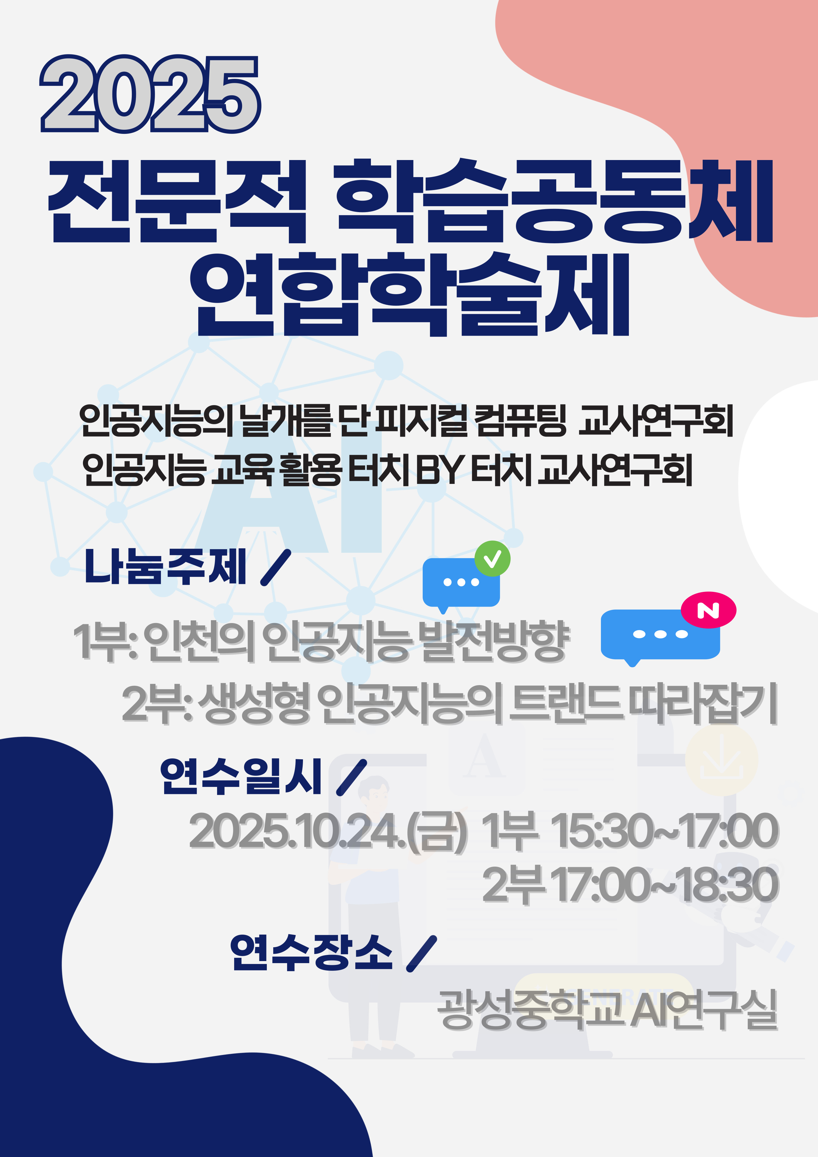연합팀 AI・디지털교육/에듀테크 중구 "1) 생성형 인공지능의 트랜드 따라잡기 2) 인천 인공지능의 발전방향" 공동체명인공지능의 날개를 단 피지컬컴퓨팅 교사연구회, 인공지능 교육 활용 터치 BY 터치 교사연구회 일시2025년 10월 24일 15:30 - 18:30 장소광성중 3층 AI연구실 좌석11석 / 30석 나눔방법공개 연수(대면) 담당자광성중 김세호 신청기간 마감 목록보기