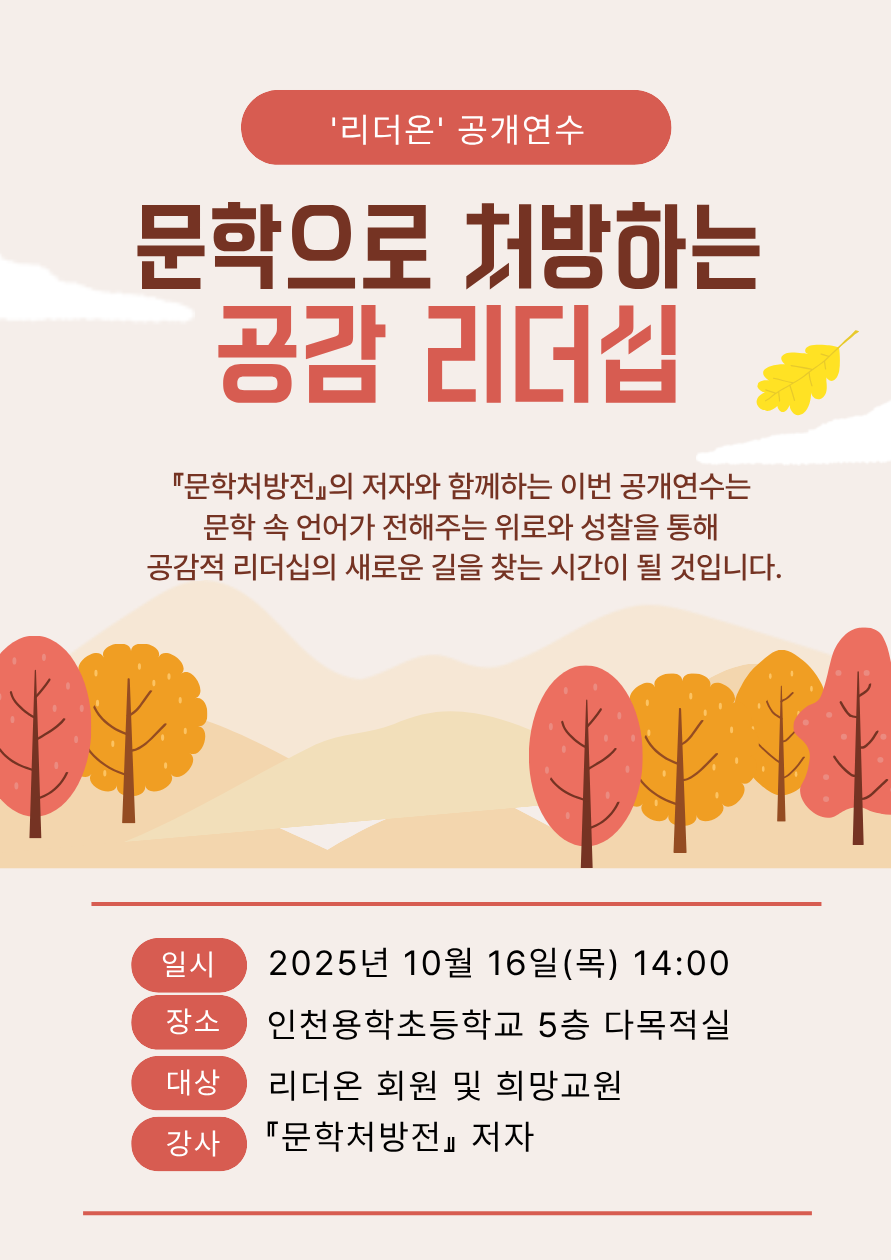 주제연구형 사회정서학습(SEL) 미추홀구 문학으로 처방하는 공감리더십(작가와의 만남) 공동체명리더온 일시2025년 10월 16일 14:00~16:30 장소인천용학초 5층 다목적실 좌석13석 / 20석 나눔방법공개연수(대면) 담당자인천용학초병설유치원 성은영 신청기간 마감 목록보기