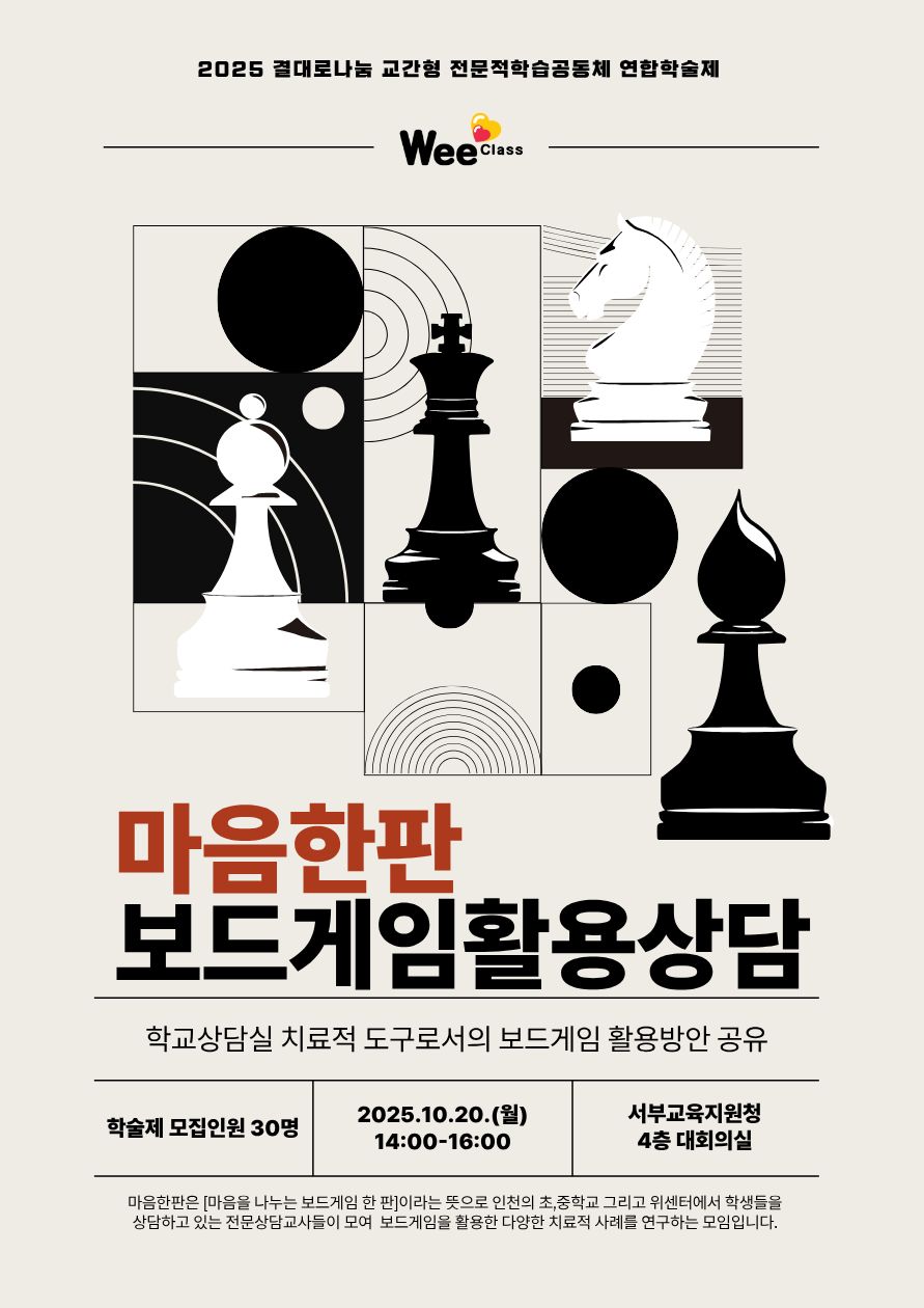 주제연구형 상담 서구 학교상담실 치료적 도구로서의 보드게임 활용 방안 공유 공동체명마음 한 판 일시2025년 10월 20일 14:00 ~ 16:00 장소인천서부교육지원청 4층 대회의실 좌석30석 / 30석 나눔방법워크숍(대면) 담당자인천부흥초 노혜민 신청마감 목록보기