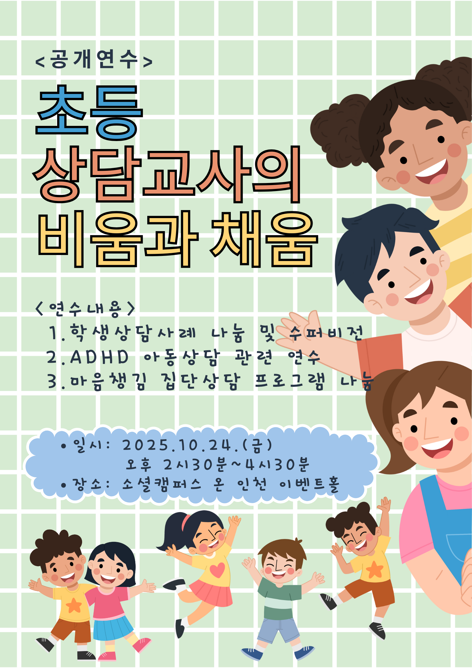 주제연구형 상담 연수구 초등학생 개인상담수퍼비젼 및 집단상담 프로그램 나눔 공동체명초등전문상담교사의 비움과 채움 일시2025년 10월 24일 14:30 ~ 16:30 장소소셜캠퍼스 온 인천 (이벤트홀) 좌석29석 / 30석 나눔방법공개연수(대면) 담당자인천남촌초 이채영 신청기간 마감 목록보기