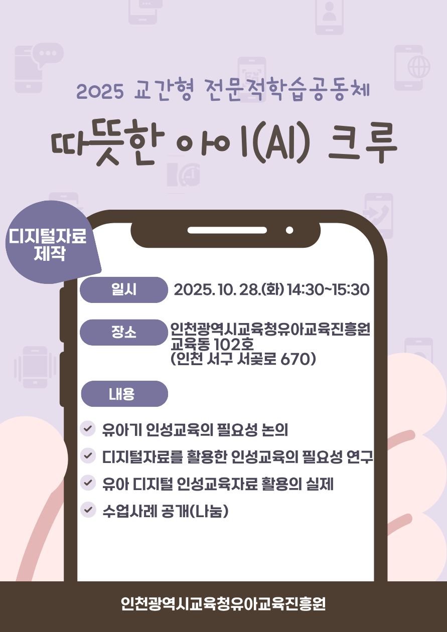 주제연구형 AI・디지털교육/에듀테크 서구 디지털 자료 활용 인성교육 자료 제작 및 수업 사례 나눔 공동체명따뜻한 아이(AI)크루 일시2025년 10월 28일 14:30 - 15:30 장소인천광역시교육청 유아교육진흥원 교육동 102호 좌석12석 / 20석 나눔방법수업나눔(대면) 담당자유아교육진흥원 전지은 신청기간 마감 목록보기