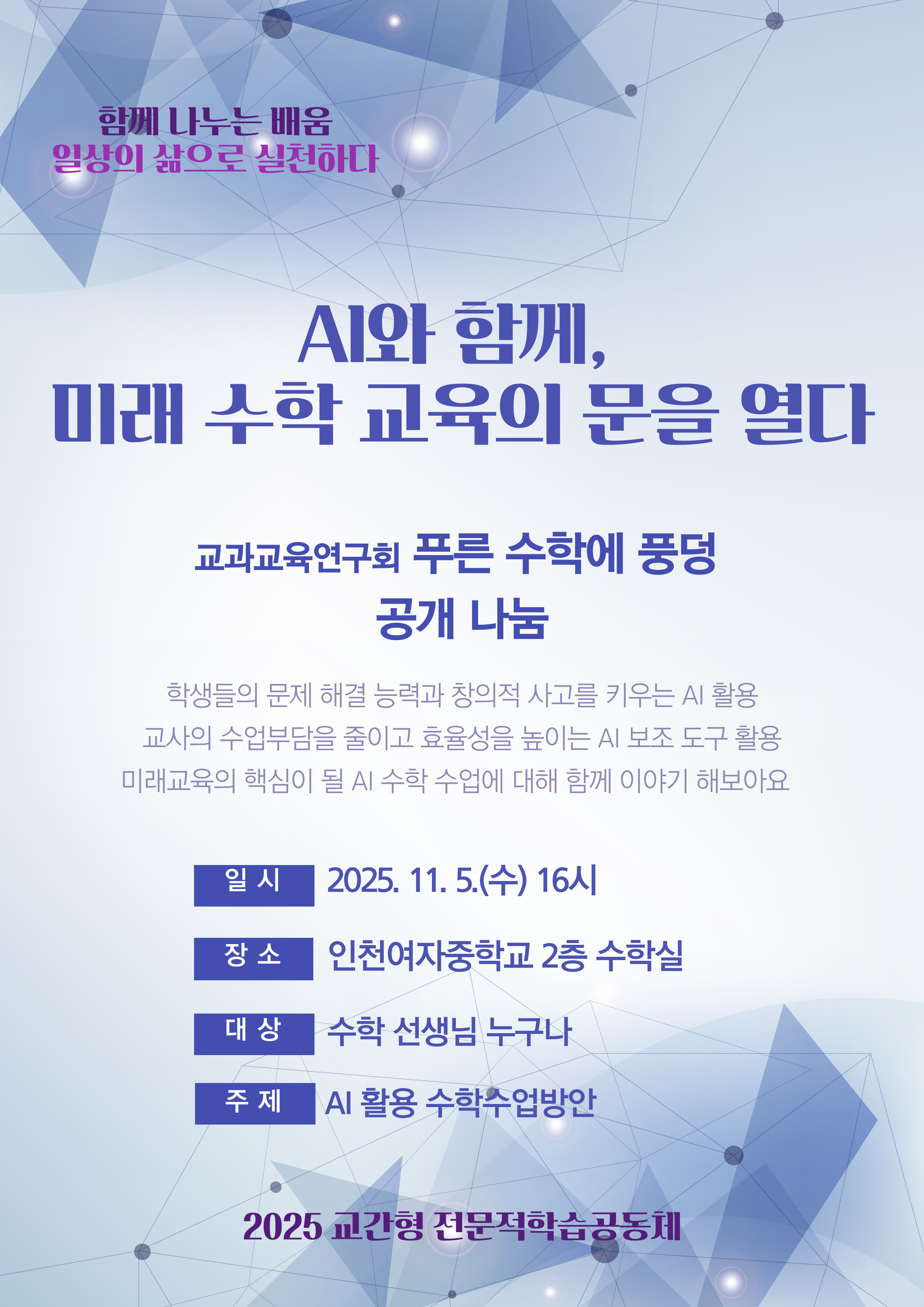 교과교육연구(회)형 수학 연수구 AI 활용 수학수업방안 공동체명푸른 수학에 풍덩 일시2025년 11월 05일 16:00 - 18:00 장소인천여중 2층 수학실 좌석17석 / 20석 나눔방법수업나눔(대면) 담당자인천은송중 정지은 신청기간 마감 목록보기