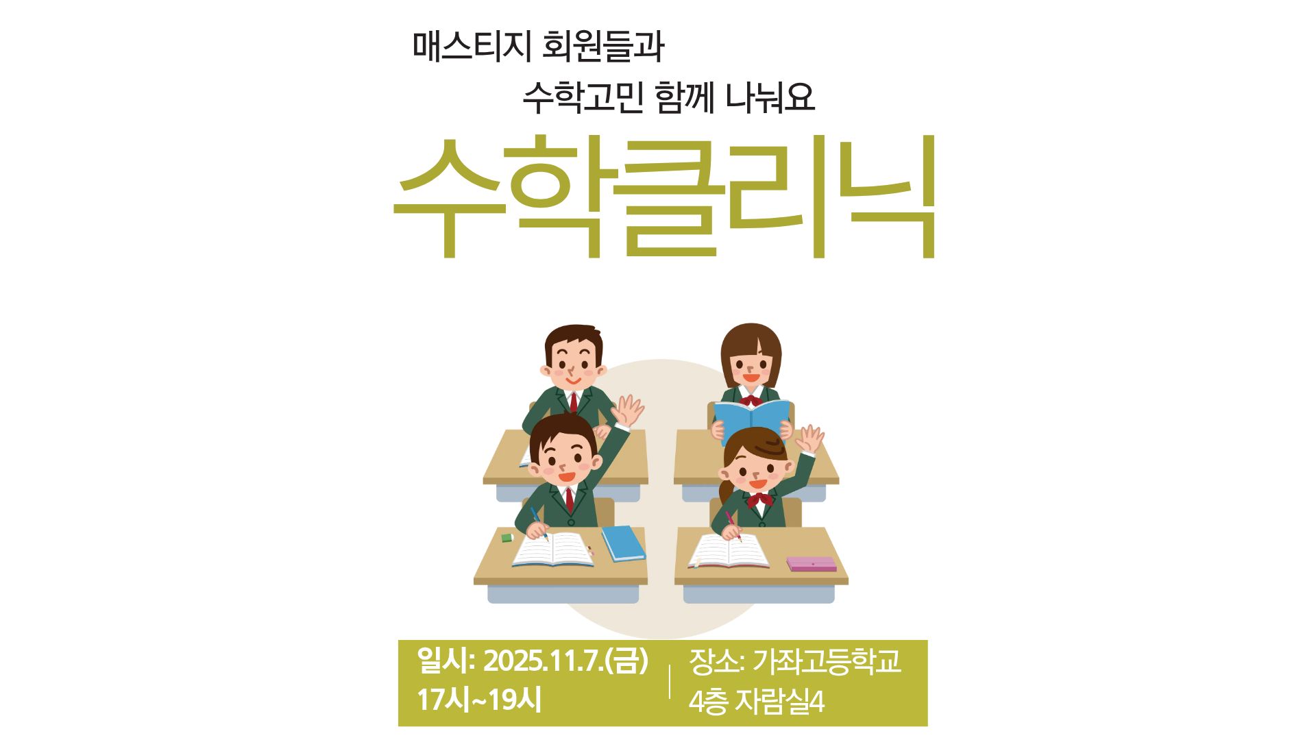 주제연구형 수학 서구 수학고민 함께 나누는 수학클리닉 운영 공동체명매스티지 일시2025년 11월 07일 17:00 - 19:00 장소가좌고 4층 자람실4 좌석13석 / 20석 나눔방법워크숍(대면) 담당자가좌고 이병진 신청기간 마감 목록보기