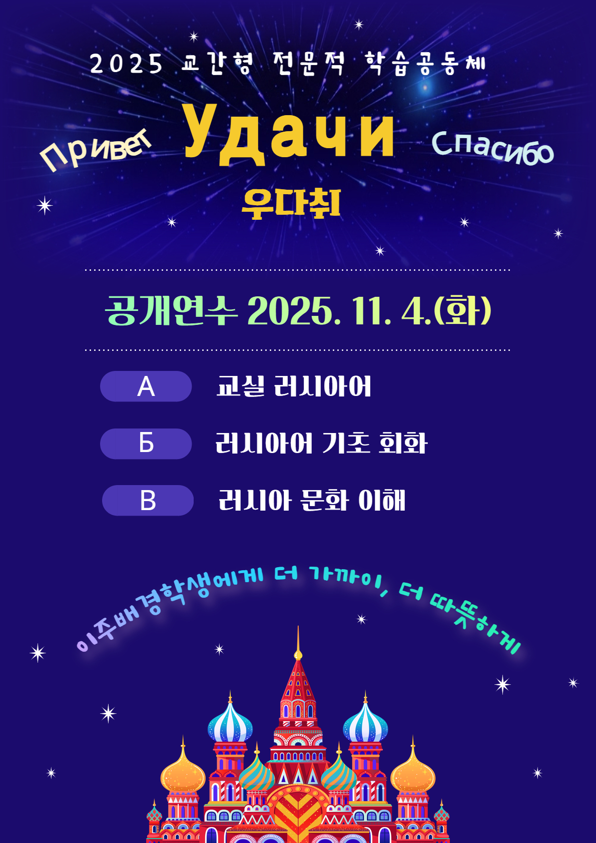 주제연구형 언어/외국어 연수구 이주배경학생에게 더 가까이, 더 따뜻하게 공동체명удачи우다취 일시2025년 11월 04일 15:00 - 16:00 장소인천문남초 어울림반 좌석13석 / 30석 나눔방법공개연수(대면) 담당자인천문남초 김동순 신청기간 마감 목록보기
