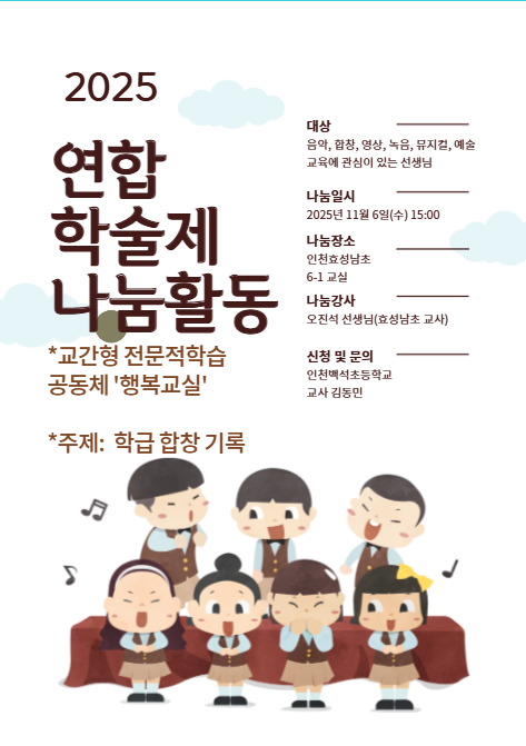 주제연구형 예체능(음,미,체 등) 계양구 학급 합창 기록하기 공동체명행복교실 일시2025년 11월 06일 15:00 ~ 16:30 장소인천효성남초 6-1교실 좌석15석 / 20석 나눔방법수업나눔(대면) 담당자인천백석초 김동민 신청기간 마감 목록보기