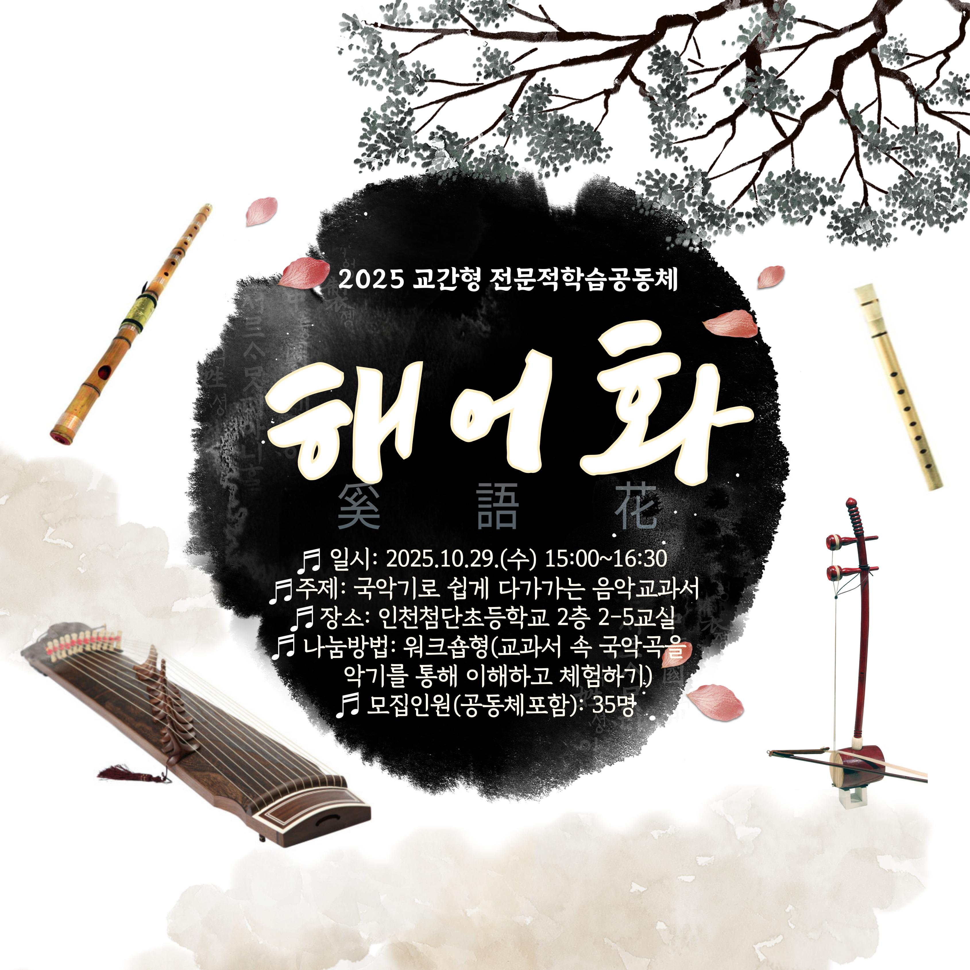 교과교육연구(회)형 예체능(음,미,체 등) 연수구 국악기로 쉽게 다가가는 음악교과서 공동체명해어화 일시2025년 10월 29일 15:00 - 16:30 장소인천첨단초 2층 2-5교실 좌석20석 / 35석 나눔방법워크숍(대면) 담당자인천고잔초 정승연 신청기간 마감 목록보기