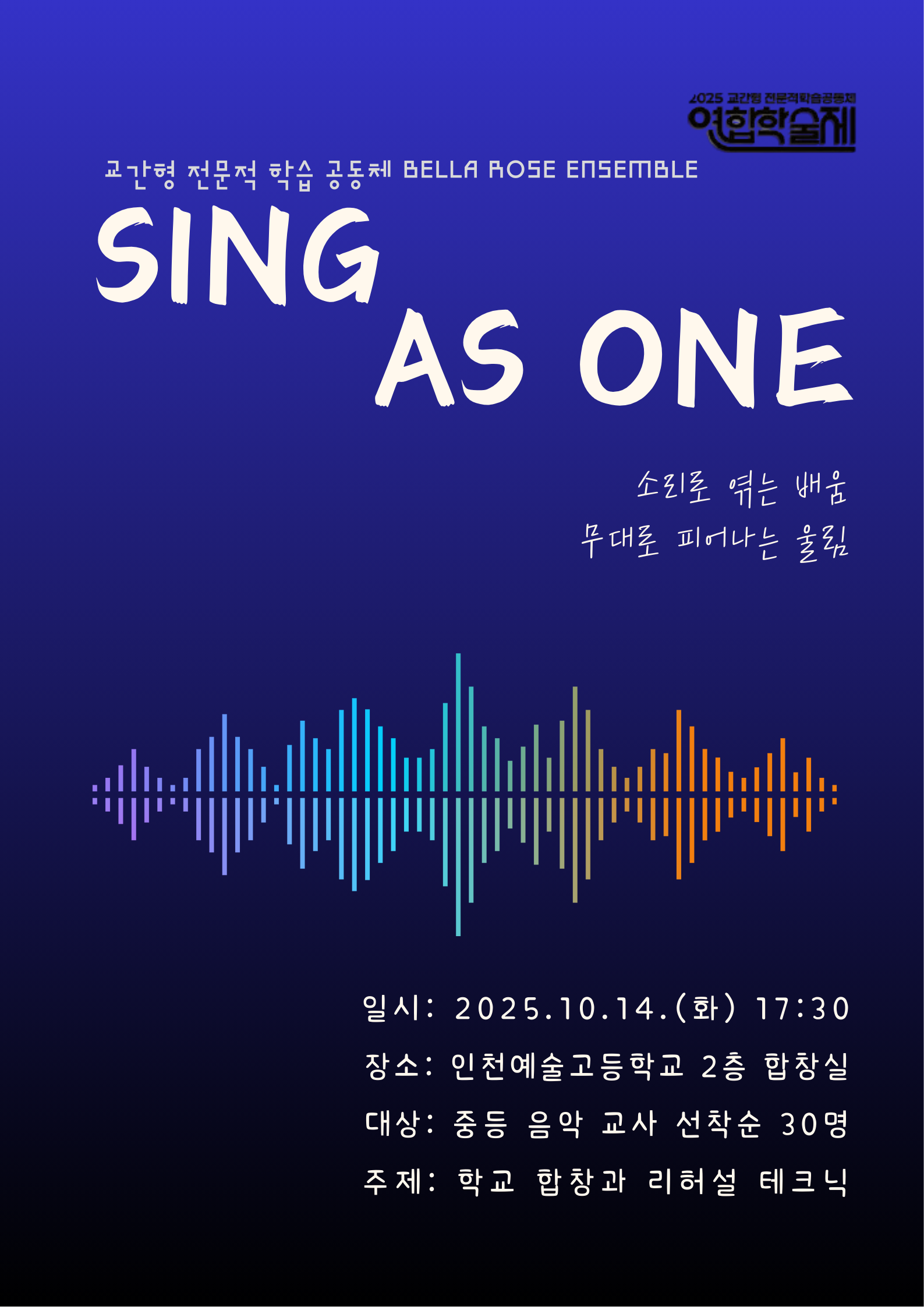 주제연구형 예체능(음,미,체 등) 남동구 소리로 엮는 배움, 무대로 피어나는 울림 :학교 합창과 리허설 테크닉 공동체명벨라로제 앙상블 일시2025년 10월 14일 17:30 - 19:30 장소인천예술고 합창실 좌석18석 / 30석 나눔방법워크숍(대면) 담당자인천신현고 양보라 신청기간 마감 목록보기