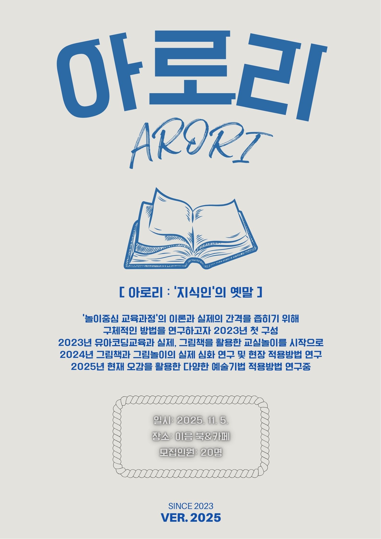 주제연구형 예체능(음,미,체 등) 남동구 오일파스텔을 활용한 유아 예술 놀이 공동체명아로리(`지식인`의 옛말) 일시2025년 11월 05일 14:30 - 15:30 장소이음 북&카페 좌석20석 / 20석 나눔방법수업나눔(대면) 담당자인천정각초병설유치원 김하림 신청마감 목록보기
