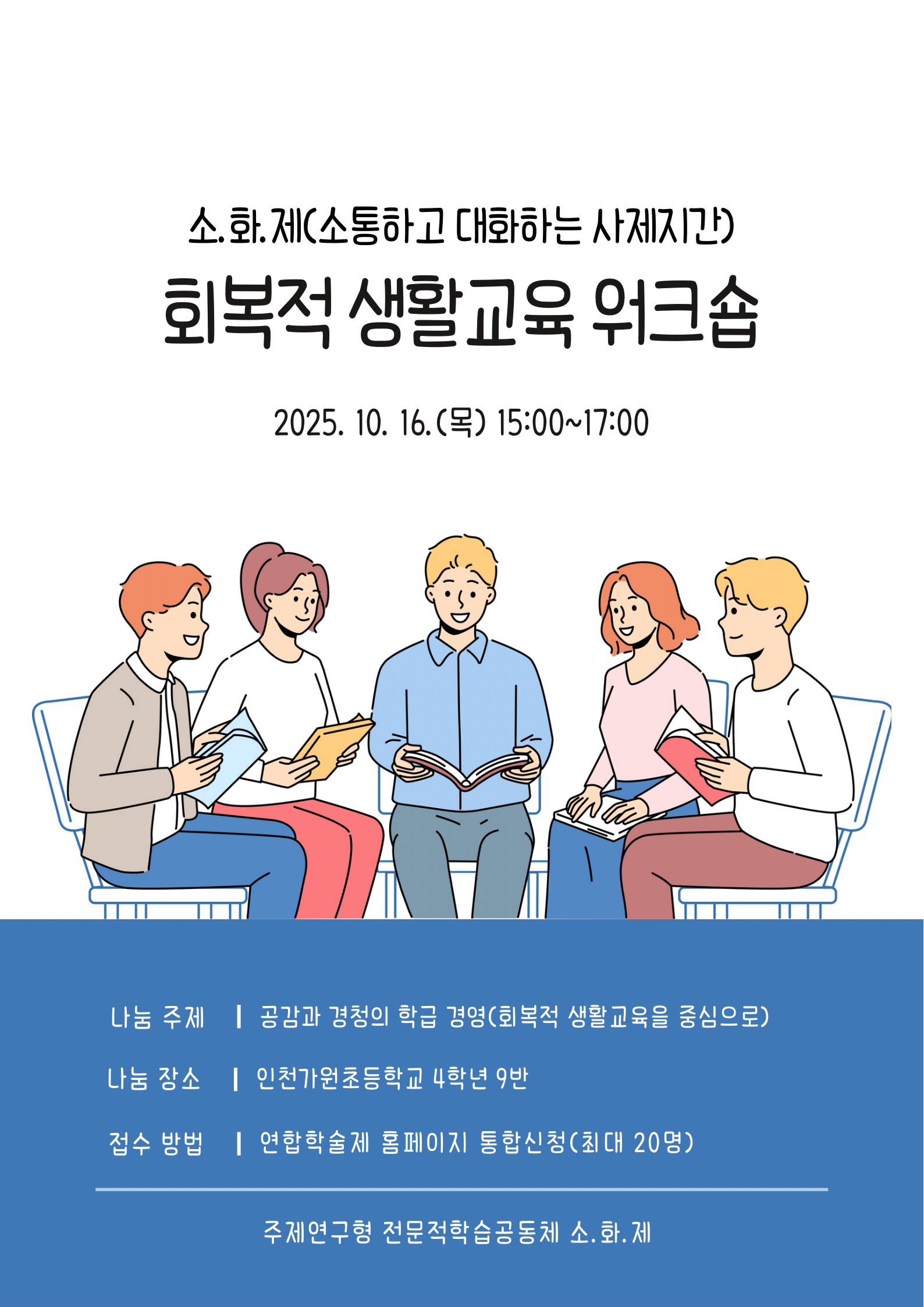 주제연구형 평화/생활교육 서구 공감과 경청의 학급경영(회복적 생활교육을 중심으로) 공동체명소.화.제.(소통하고 대화하는 사제지간) 일시2025년 10월 16일 15:00 - 17:00 장소인천가원초 4-9교실 좌석20석 / 20석 나눔방법워크숍(대면) 담당자인천경서초 최희석 신청마감 목록보기