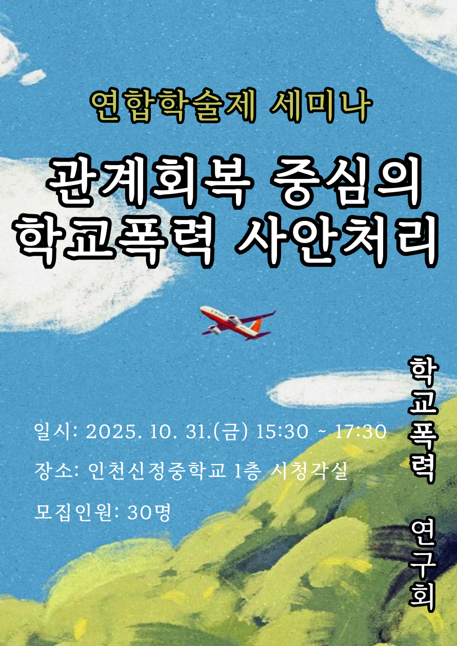 주제연구형 평화/생활교육 연수구 관계회복 중심의 사안처리 공동체명학교폭력 연구회 일시2025년 10월 31일 15:30 - 17:30 장소인천신정중 1층 시청각실 좌석25석 / 30석 나눔방법세미나(대면) 담당자인천운서중 임영묵 신청기간 마감 목록보기