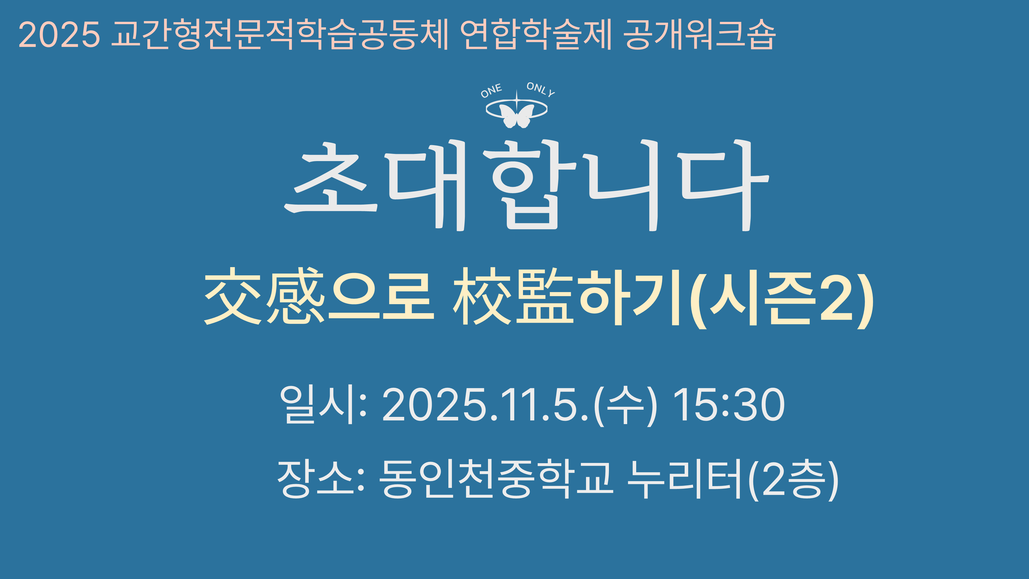 주제연구형 학교경영 남동구 학생맞춤통합지원 현장 안착 방안 공동체명交感으로 校監하기(시즌2) 일시2025년 11월 05일 15:30 - 16:30 장소동인천중 2층 누리터 좌석18석 / 30석 나눔방법워크숍 (대면) 담당자인천중학교 권혁성 신청기간 마감 목록보기