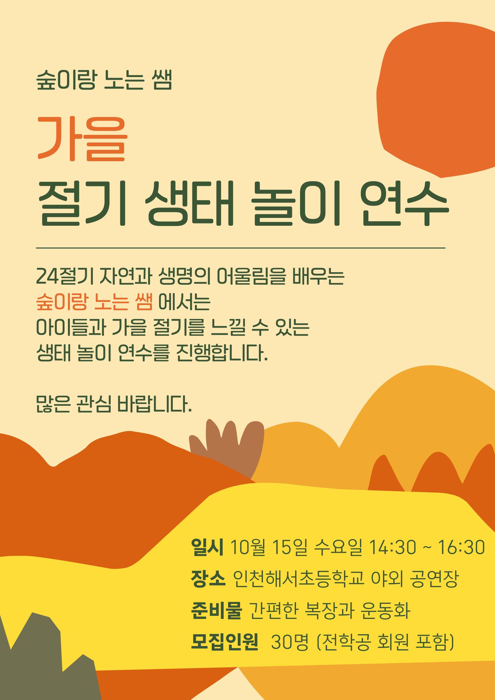 교과교육연구(회)형 환경/생태 계양구 가을절기생태놀이연수 공동체명2025 숲이랑 노는 쌤 일시2025년 10월 15일 14:30 - 16:30 장소인천해서초 야외공연장 좌석20석 / 30석 나눔방법공개연수(대면) 담당자인천해서초 박창용 신청기간 마감 목록보기