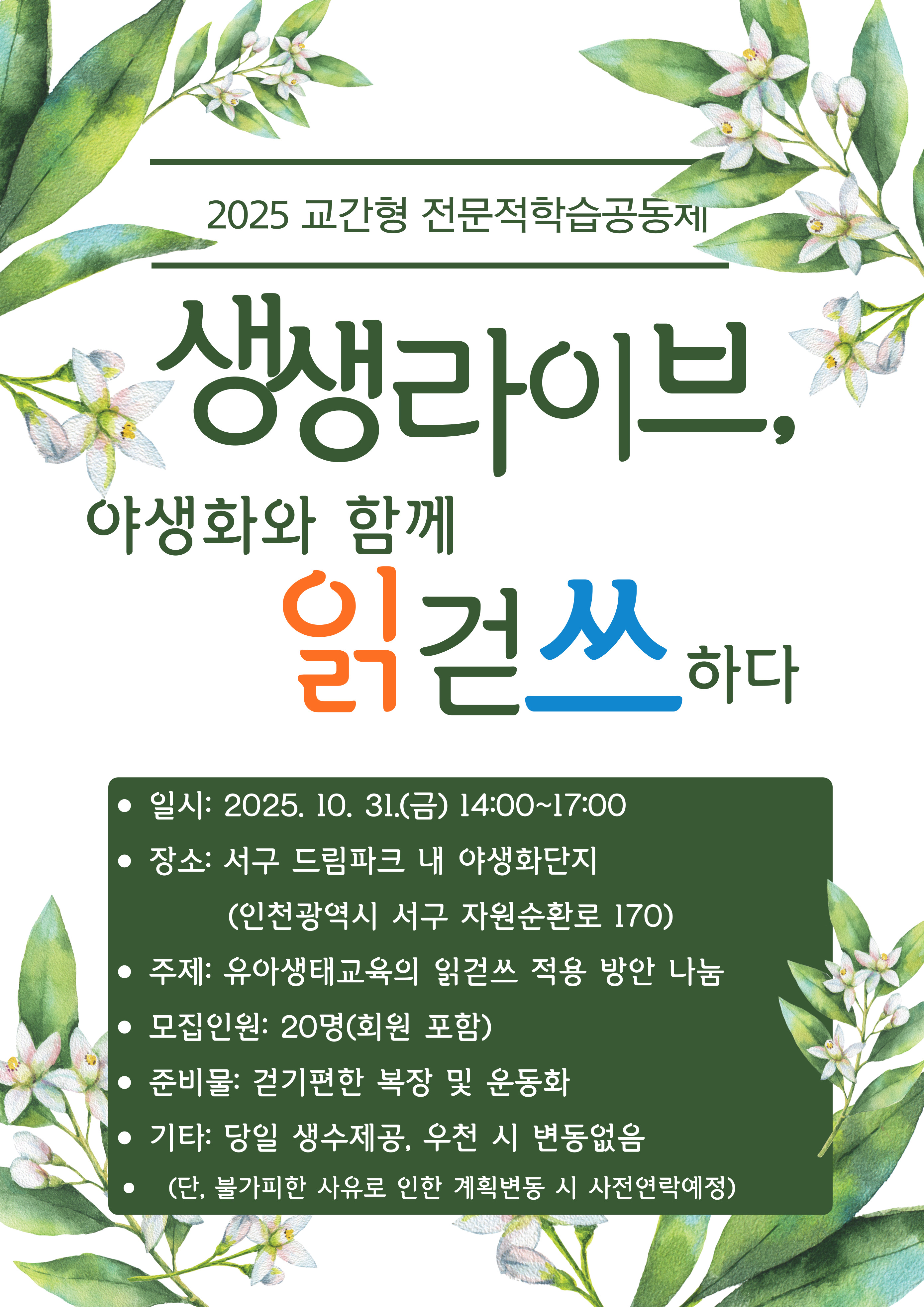 주제연구형 환경/생태 서구 유아생태교육을 위한 읽걷쓰 적용 방안 나눔 공동체명생생라이브 일시2025년 10월 31일 14:00 - 17:00 장소드림파크(야생화단지) 좌석18석 / 20석 나눔방법워크숍(대면) 담당자"인천중산초병설유치원 김윤정" 신청기간 마감 목록보기