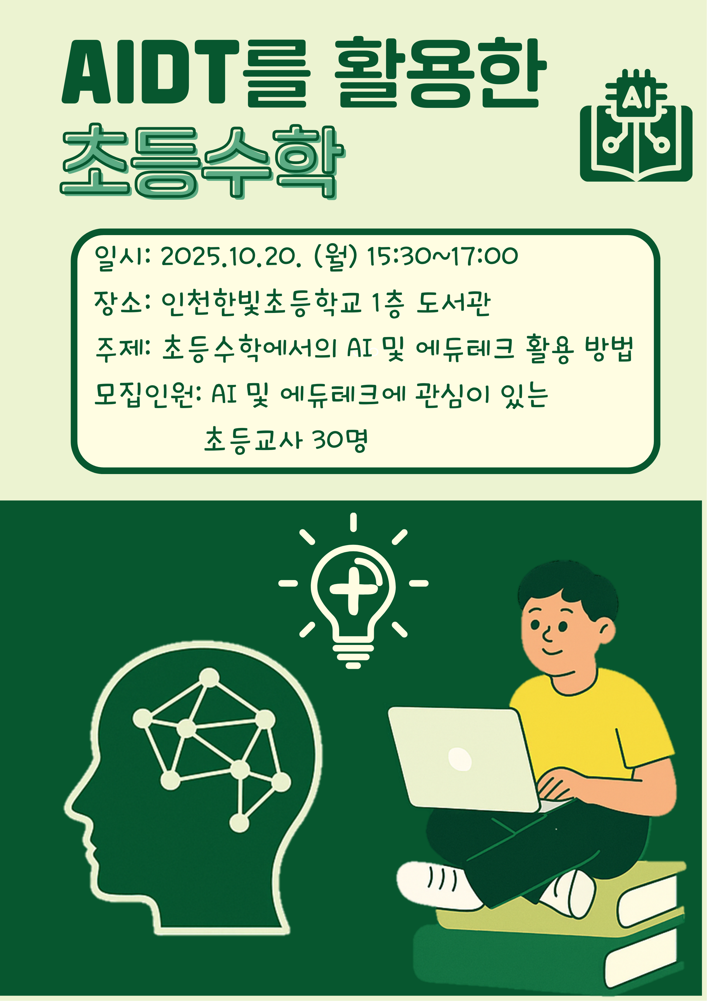 교과교육연구(회)형 AI・디지털교육/에듀테크 남동구 초등수학에서의 AI 및 에듀테크 활용 방법 공동체명AIDT를 활용한 초등수학 일시2025년 10월 20일 15:30 - 17:00 장소인천한빛초 1층 도서관 좌석10석 / 30석 나눔방법워크숍(대면) 담당자인천동춘초 이양섭 신청기간 마감 목록보기