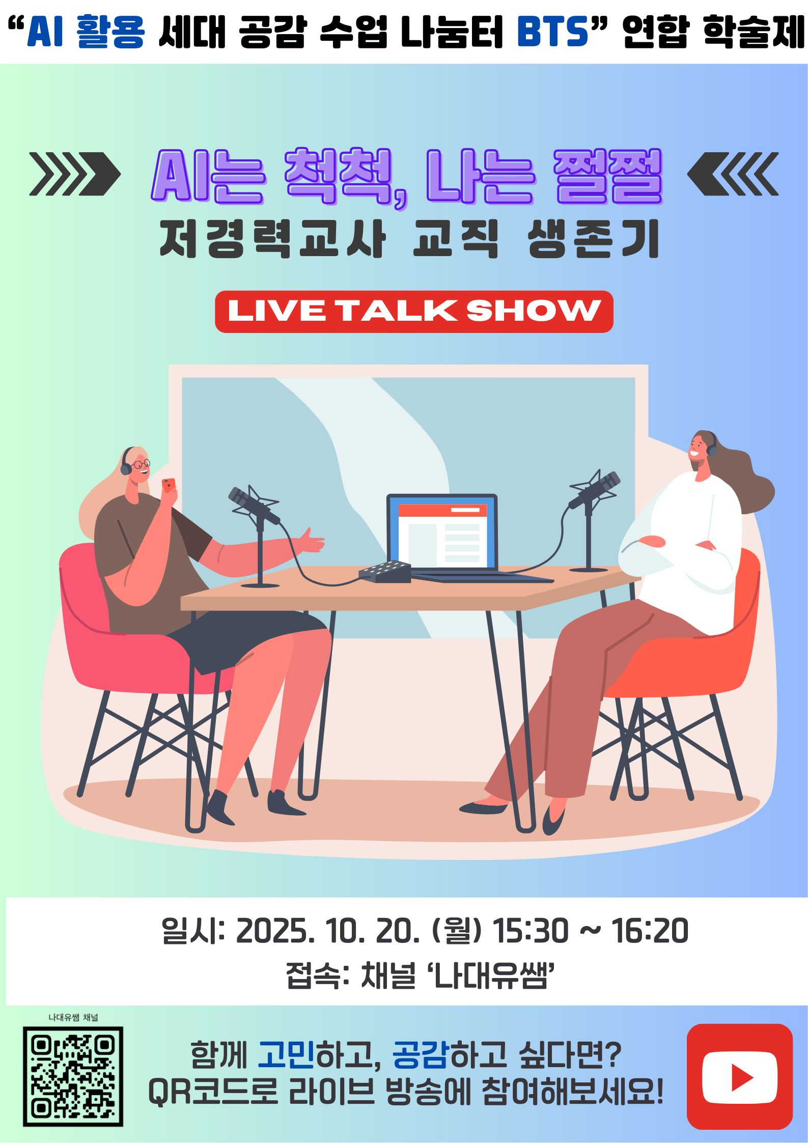 교과교육연구(회)형 AI・디지털교육/에듀테크 전체(비대면) AI는 척척, 나는 쩔쩔… 저경력교사 리얼 적응기 공동체명AI활용 세대공감 수업 나눔터 BTS 일시2025년 10월 20일 15:30 - 16:20 장소유튜브 라이브 생중계 (채널명: 나대유쌤) 좌석25석 / 40석 나눔방법공개연수, 토크쇼(비대면) 담당자인천하정초 정누리 신청기간 마감 목록보기