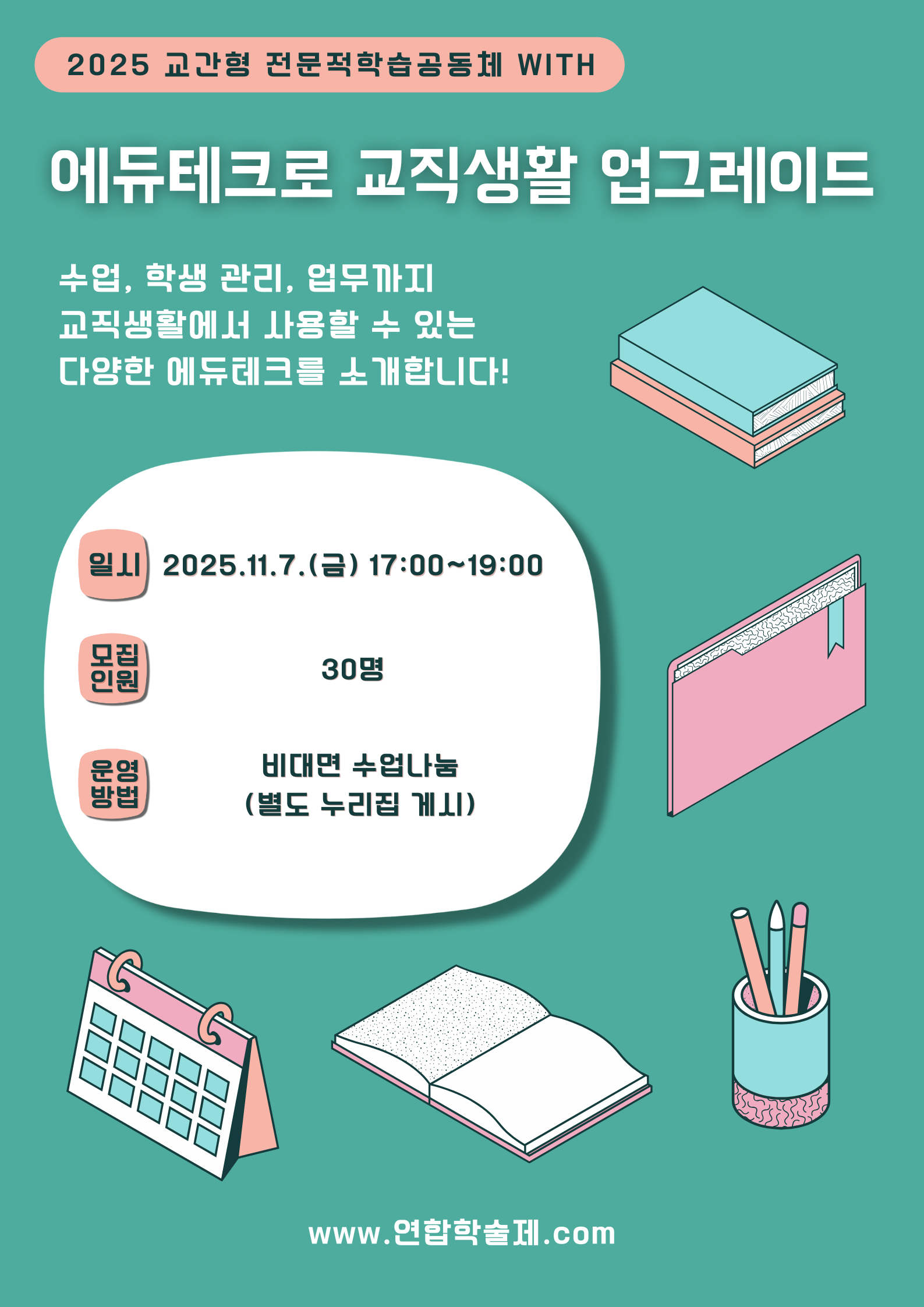 교과교육연구(회)형 AI・디지털교육/에듀테크 전체(비대면) 에듀테크로 교직생활 업그레이드 공동체명WITH 일시2025년 11월 07일 17:00 - 19:00 장소비대면 좌석9석 / 30석 나눔방법수업나눔(비대면) 담당자영흥중 임재영 신청기간 마감 목록보기
