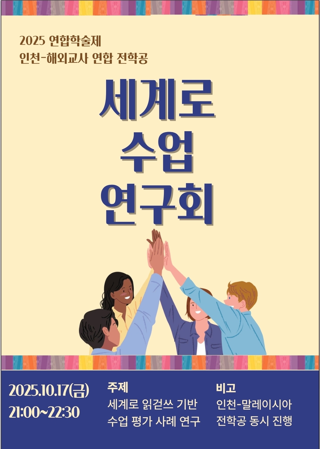 교과교육연구(회)형 AI・디지털교육/에듀테크 전체(비대면) 세계로 읽걷쓰 기반 수업 평가 사례 연구(인천-해외 교사 참여를 통한 비교연구) 공동체명세계로수업연구회 일시2025년 10월 17일 21:00 - 22:30 장소비대면 좌석11석 / 30석 나눔방법워크숍(비대면) 담당자학익고 김성희 신청기간 마감 목록보기