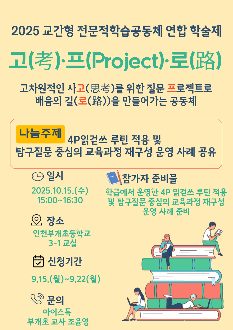 교과교육연구(회)형 읽걷쓰교육 부평구 4P 읽걷쓰 루틴 적용 및 탐구질문 중심의 교육과정 재구성 운영 사례 공유 공동체명고(考)·프(Project)·로(路) 일시2025년 10월 15일 15:00 - 16:30 장소인천부개초 3-1교실 좌석12석 / 15석 나눔방법세미나(대면) 담당자인천부개초 조윤영 신청기간 마감 목록보기