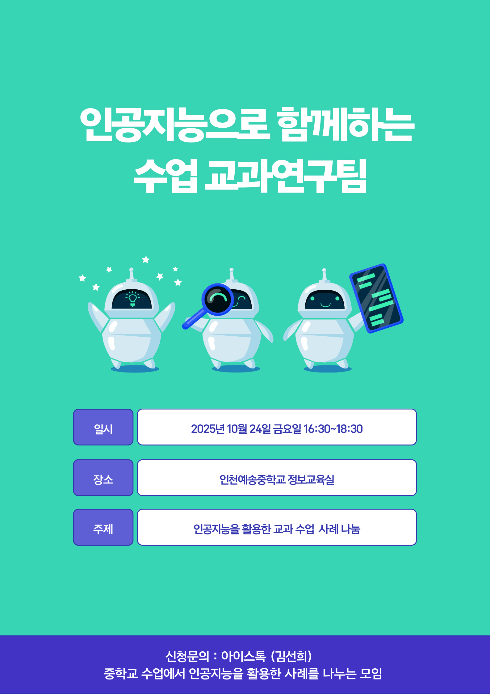 교과교육연구(회)형 AI・디지털교육/에듀테크 연수구 인공지능을 활용한 교과 수업 사례 공동체명인공지능으로 함께하는 수업 일시2025년 10월 24일 16:30 - 18:00 장소인천예송중 정보교육실 좌석15석 / 15석 나눔방법워크숍(대면) 담당자인천예송중 김선희 신청마감 목록보기