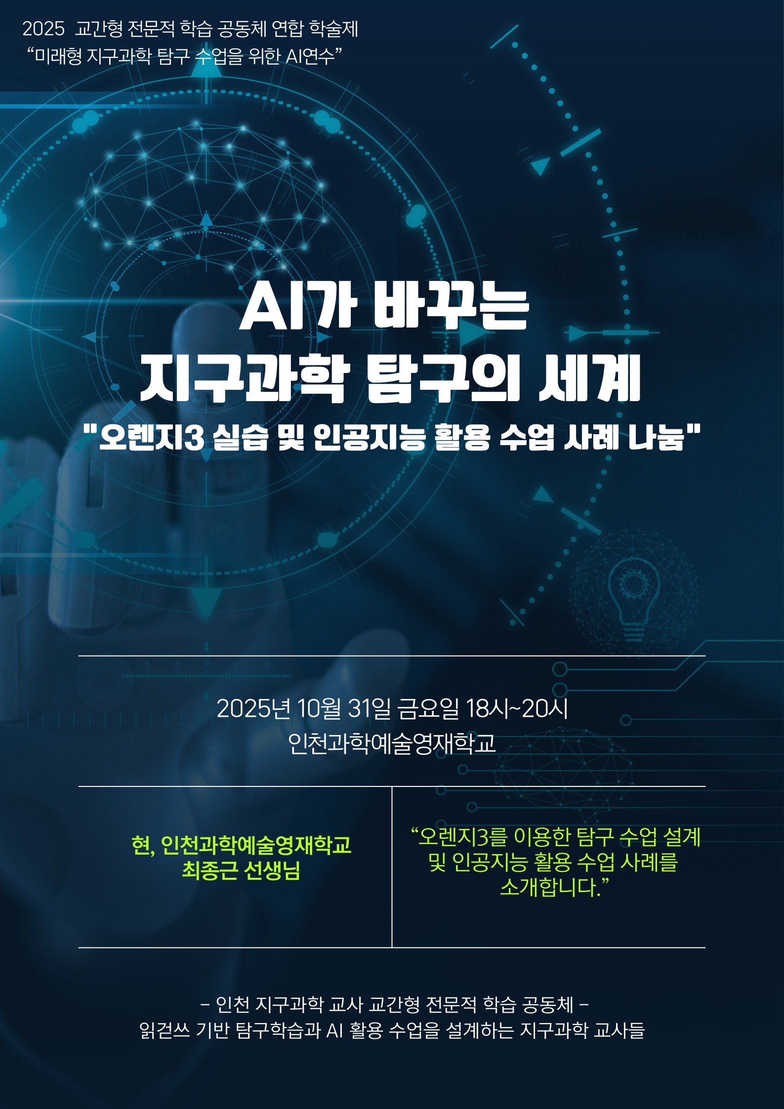 교과교육연구(회)형 AI・디지털교육/에듀테크 연수구 AI가 바꾸는 지구과학 탐구 활동 공동체명읽걷쓰기반 탐구학습 및 AI활용 수업을 함께 설계하는 지구과학 교사들 일시2025년 10월 31일 18:00 - 20:00 장소인천과학예술영재학교 지구과학실험실1 좌석13석 / 40석 나눔방법수업나눔(대면) 담당자인천만수고 임혜준 신청기간 마감 목록보기