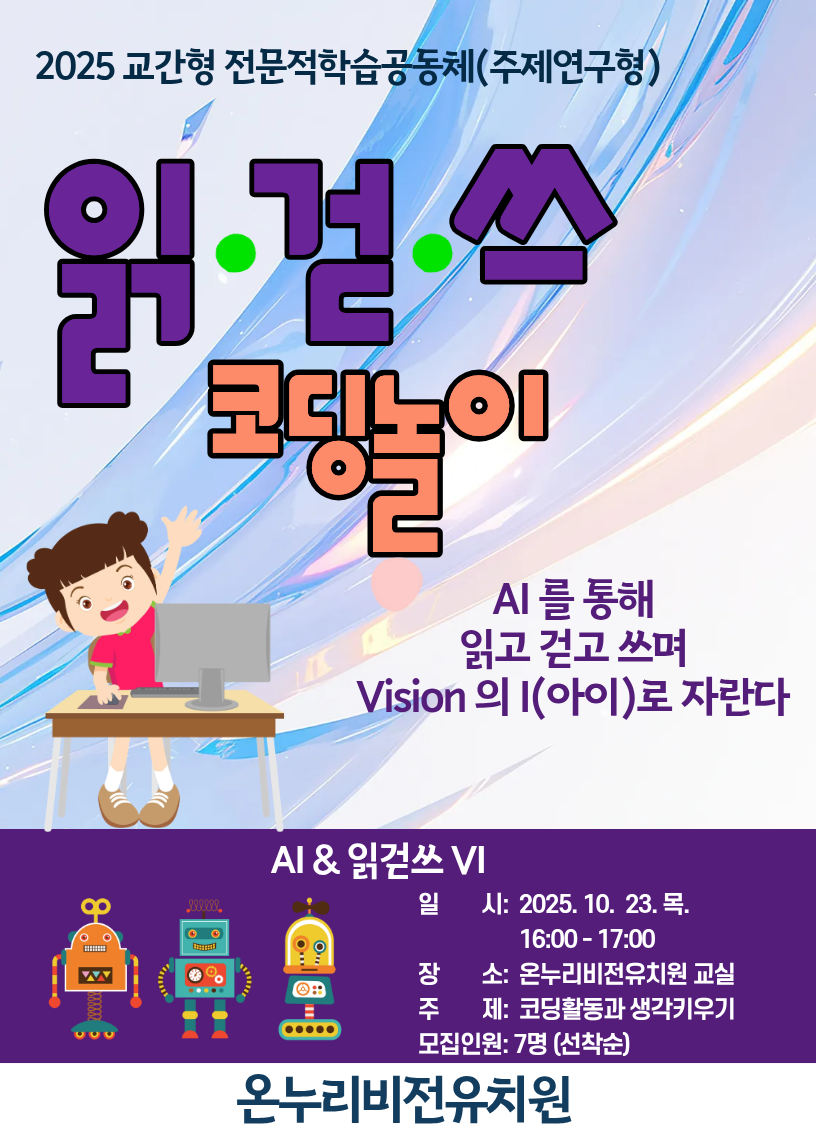 주제연구형 AI・디지털교육/에듀테크 연수구 코딩활동과 생각키우기 공동체명AI & 읽걷쓰 VI 일시2025년 10월 23일 16:00 - 17:00 장소온누리비전유치원 교실 좌석7석 / 7석 나눔방법수업나눔(대면) 담당자온누리비전유치원 허하숙 신청마감 목록보기