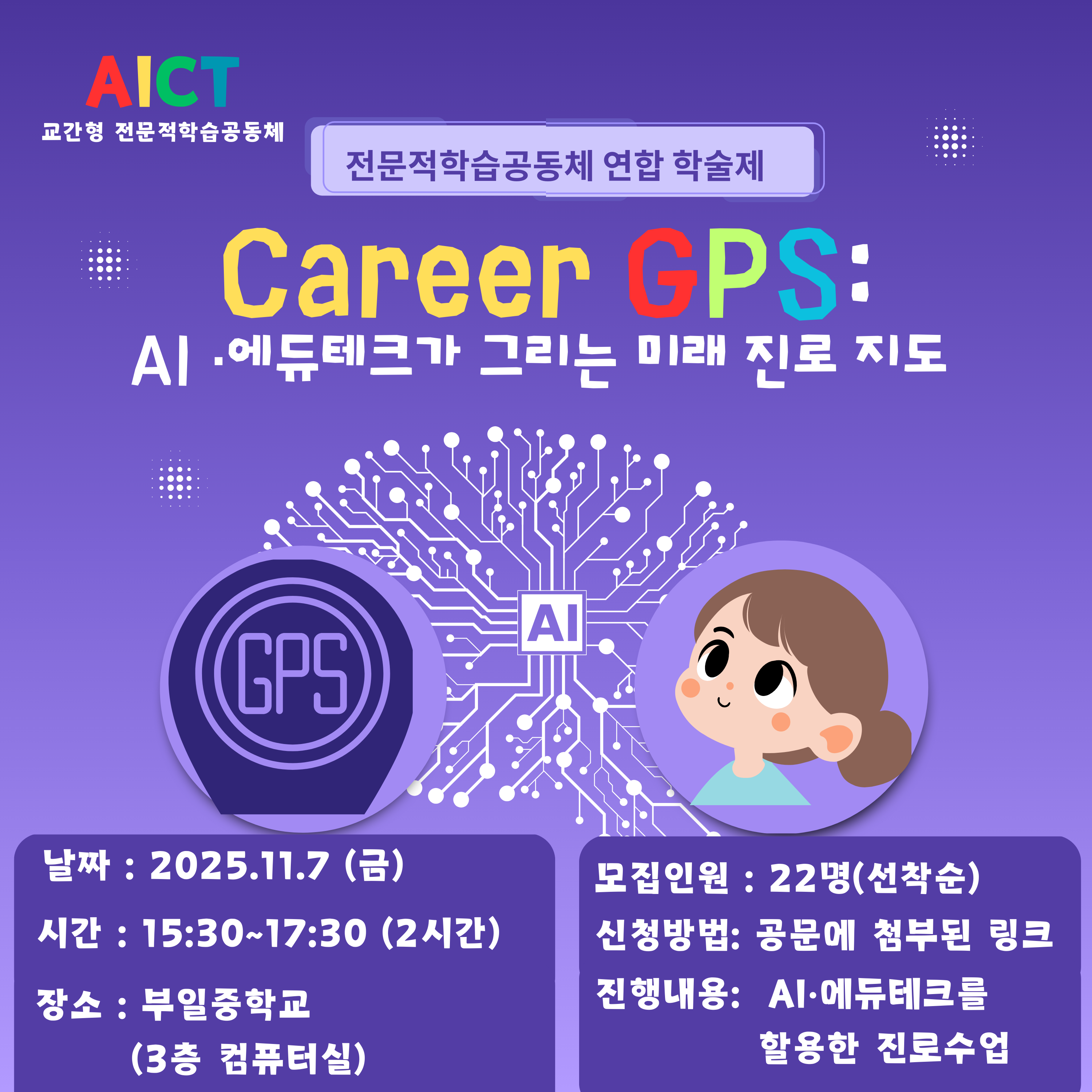 주제연구형 AI・디지털교육/에듀테크 부평구 Career GPS: AI·에듀테크가 그리는 미래 진로 지도 공동체명AICT 일시2025년 11월 07일 15:30 - 17:30 장소부일중 3층 컴퓨터실 좌석22석 / 22석 나눔방법워크숍(대면) 담당자부원여중 박현주 신청마감 목록보기